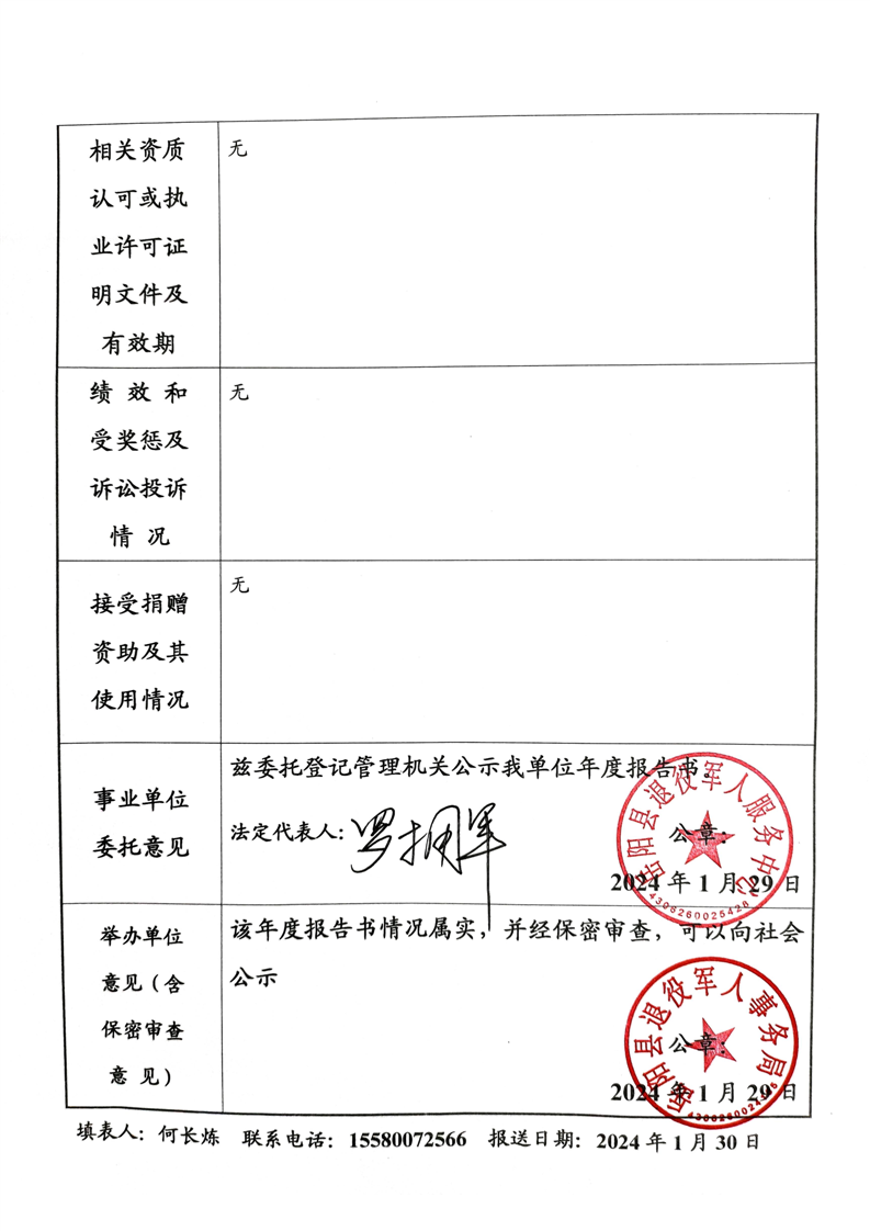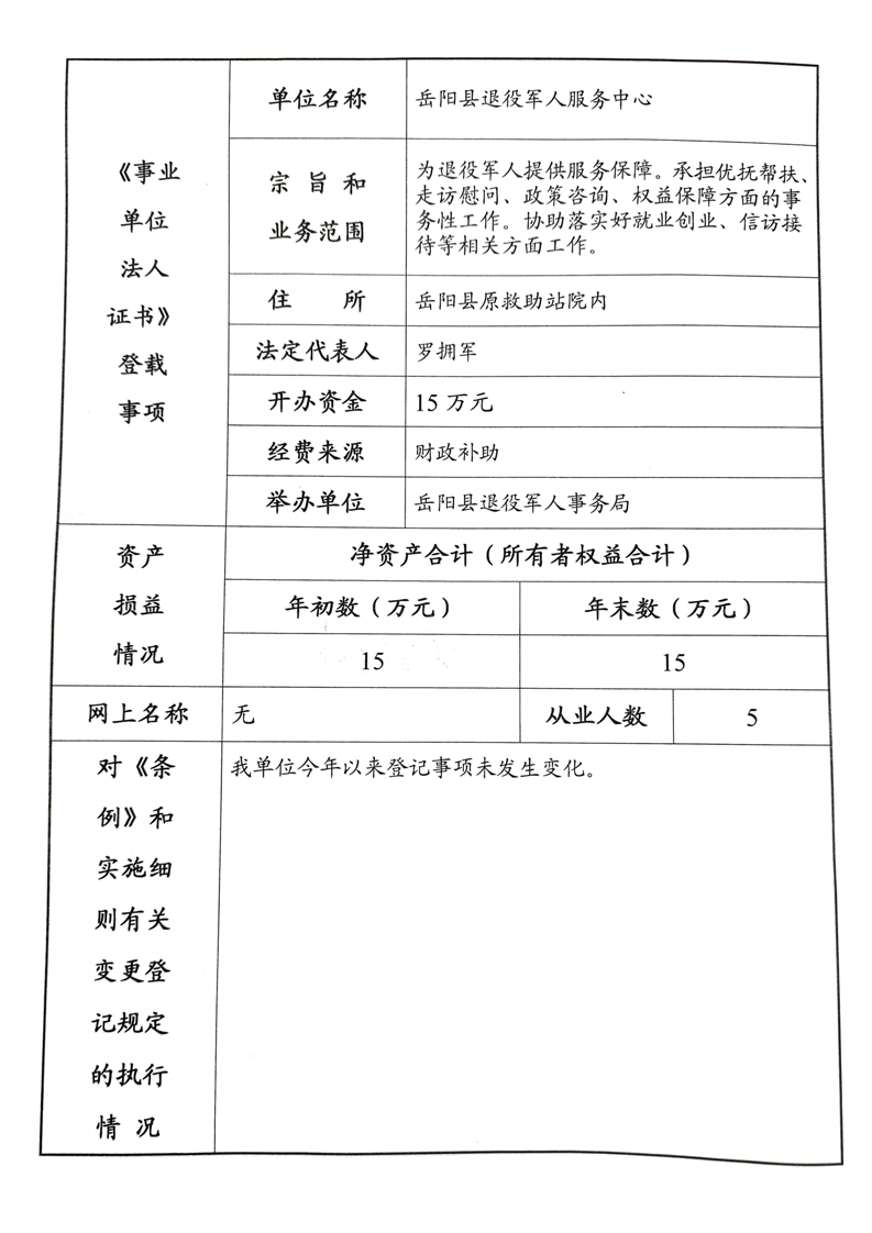 岳阳县退役军人服务中心事业单位法人年度报告书