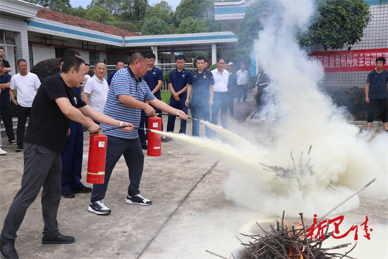 培训中,消防大队蒋传洋同志以典型案例为切入点,围绕常见的火源、常见的隐患、如何做好民政服务机构管理工作、如何逃生五个方面展开系统讲解授课。随后,消防队员现场演示了干粉灭火器的正确使用方法,包括检查压力表、拔掉保险销、握住喷管、对准火焰根部喷射等操作步骤,并指导参训人员进行灭火器实操训练,确保能熟练掌握灭火技能。