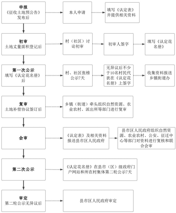 (二)严格认定身份。按照“人地对应”的原则,被征地农民社会保障对象的身份核定实行村(居)委会初审、乡镇人民政府复审、县人民政府审定和村(社区)公示、县公示的“三审两公示”工作机制。主要按照如下程序进行身份认定(见附件1《湖南省被征地农民社会保障对象认定流程图》)。
