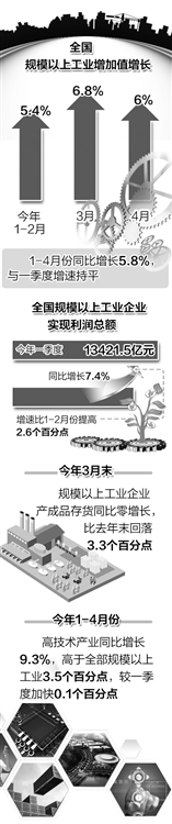 今-1至4-,我国工业供给侧结构性改革取得积极进展,一方面表现为工业生产结构的改善、过剩产能的化解、成本费用的降低、企业效益的好转;另一方面,高技术产业、战略性新兴产业、新产品的快速增长,显现出新动能、新引擎的增长潜力和推动作用,从而使工业经济在转型升级、动力转换中保持了平稳发展。
