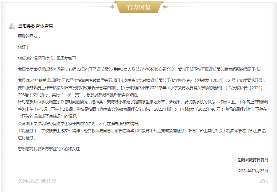 2024年秋季岳阳县荣湾湖小学原来五年级正常上课下午都是三节课,现在减少了一节课,三点多就放学了,把正常的课改成了晚辅课,为什么把正常课改成收费的课,学校不是在变相收费吗,不上晚辅还强制性,说晚辅要讲课,学校各种变相收费,书本也是,说是不强制买,老师就说哪个哪个要上课用,一年书本都五六百,免费义务教育,都比以前收费都贵,希望有关部门能真正关心一下教育问题。