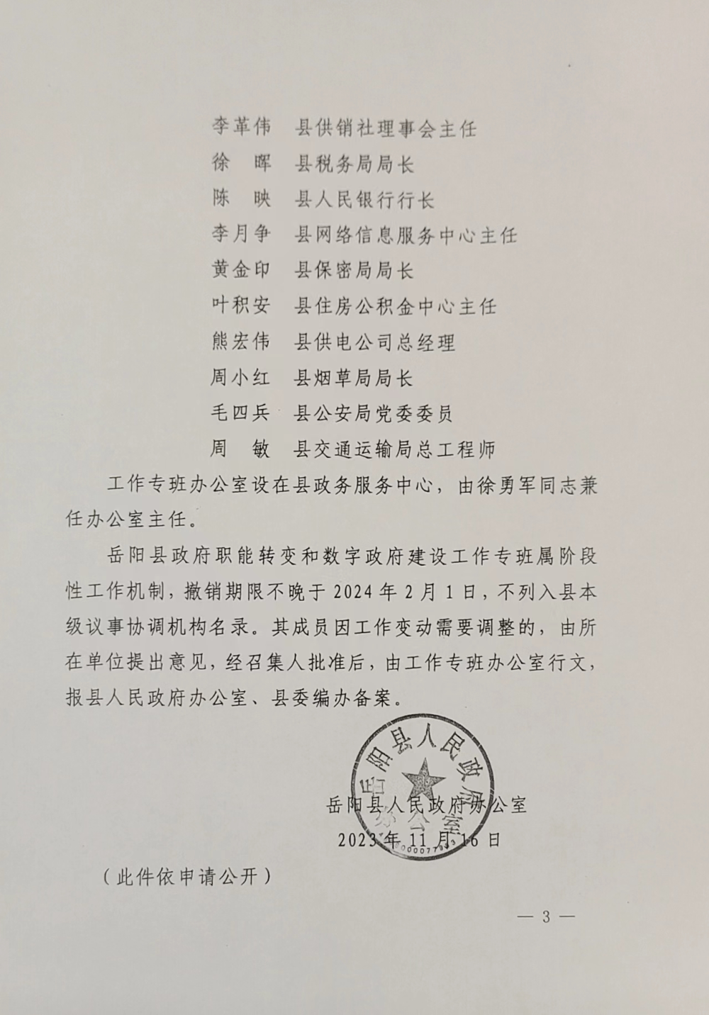 岳阳县人民政府办公室关于成立岳阳县政府职能转变和数字政府建设工作专班的通知