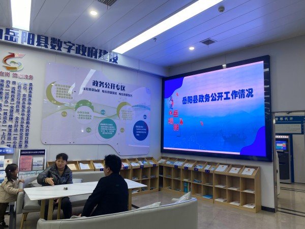 (政务公开专区设岳阳县长丰路1号政务服务中心院内B区一楼西头。公开专区有电子显示屏、资料架、政府公报等)