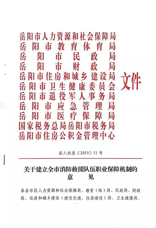 为贯彻落实中共中央关于消防改革相关文件精神,充分发挥消防救援队伍主力军和国家队作用。11月25日,岳阳市十一个部门联合印发《关于建立全市消防救援队伍职业保障机制的意见》(岳人社发﹝2019﹞51号,以下简称《意见》)。