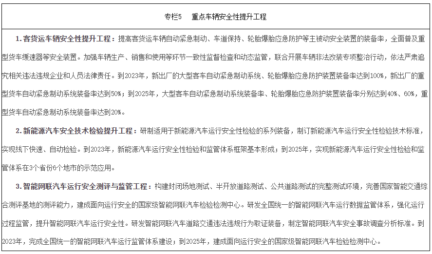 强化标准引领,修订机动车运行安全国家标准,研究制定经营性机动车运营安全国家标准,推进客货运车辆辅助安全、主被动安全标准升级。提升载客汽车安全要求,提升客运车辆阻燃性能水平,提高客运车辆安全逃生要求;提升车高大于或等于1850mm的小微型普通客车、面包车安全性能,减少非法改装和超载空间;实行公路客运、旅游客运车辆全环节、全链条安全管理,鼓励地方政府实施在用大中型客车安全性提升行动,依法推动不符合车辆安全技术条件要求、达到报废标准的卧铺客车、57座以上大客车等退出市场,推动客运车辆安装乘员不系安全带报警装置。提升载货汽车安全要求,推动重型货车严格按照相关标准装备车道偏离预警系统和车辆前向碰撞预警系统,严格自卸半挂车、平板式清障车等违规情形较多车型的安全技术规范,提升轻型货车被动安全性能,制定实施载货车辆货物装载与栓固国家标准,提高常压液体危险货物罐式车辆罐体防撞、防漏性能,推动低平板挂车退出散货运输市场,推动在用重型货车安装右侧盲区消除预警装置等安全装置。提高客货运车辆主被动安全装置装备率,推广应用智能视频监控报警技术,重型货车全面普及缓速器等安全装置,加强中置轴挂车列车、双挂汽车列车等新型汽车列车车型运行安全研究,探索驾驶行为动态监测装置等辅助安全装置应用,研究在“两客一危”、货车等重点车型安装应用酒精锁。提升新能源汽车安全要求,构建新能源汽车运行安全性检验技术及装备体系,强化新能源汽车运行安全性检验和监管,严格规范远程升级要求,保障车辆行驶安全性。