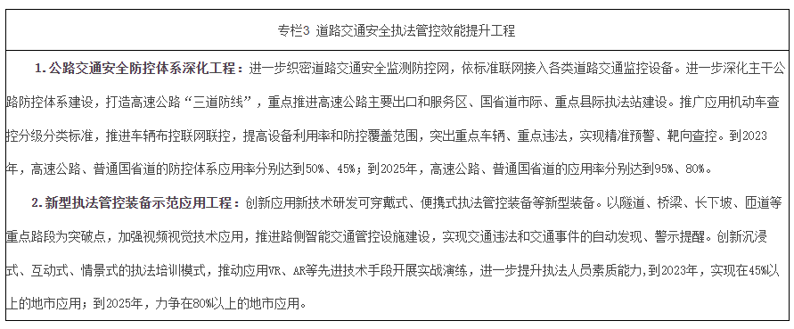 道路交通治理能力达到新水平。法治思维、系统观念不断融入道路交通安全治理,大数据、人工智能、5G等新技术充分应用于道路交通安全管理工作,交通秩序明显改善,风险防控、执法管控与应急救援等能力明显提升。