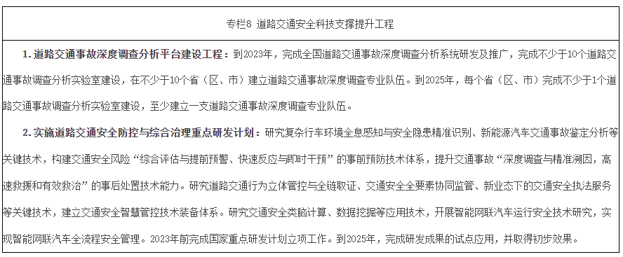 健全产、学、研、用深度融合的协同创新机制,形成行业需求引领、有效分工协作、科技创新支撑的新格局。深化道路交通全要素协同管控理论及技术研究,建构满足道路交通安全高质量发展的国家技术标准体系,做好交通安全科技顶层设计。汇聚各类创新成果,促进道路交通安全科技成果在交通安全治理中的应用推广。健全道路交通事故深度调查技术支撑体系,建设全国道路交通事故深度调查分析系统,建立道路交通事故深度调查专业队伍,推动在全国范围内建设道路交通事故调查分析实验室。推动部门层面共享涉及辅助驾驶、自动驾驶相关事故数据。