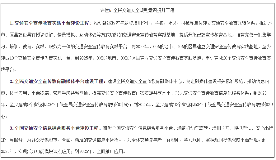 完善驾驶培训监管机制,强化驾驶培训机构落实教学基础设施设备、培训学时内容等要求,保证驾驶培训质量。健全完善驾驶培训教学体系,推动理论培训方式创新应用,强化驾驶人安全知识、规则意识、风险辨识能力培养。加强驾驶培训过程监管,强化驾驶培训与考试的信息共享。加强驾驶考试过程监管,建立以新驾驶人安全驾驶水平为核心的考试质量评估体系,实行严重交通事故驾驶人考试发证责任倒查。优化驾驶人考试内容与方法,完善面向规则意识培育的驾驶人考试机制,探索VR、人工智能等新技术在驾驶考试管理中的应用。主动适应人口老龄化、车辆智能化等社会发展需求,丰富车辆新技术、驾驶新要求等考核内容。健全完善职业驾驶人教育培训体系,提升重点驾驶人安全管理水平。建立交通安全信息综合服务平台,提供驾驶人全生命周期、全分类群体、全出行场景的交通安全知识服务。