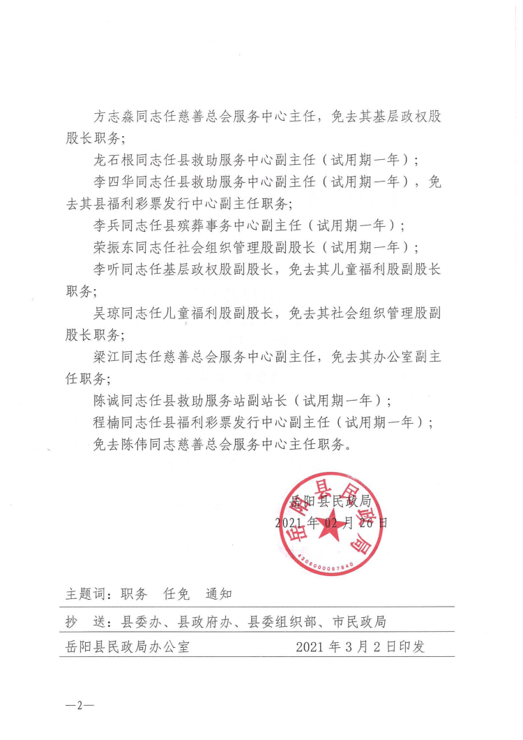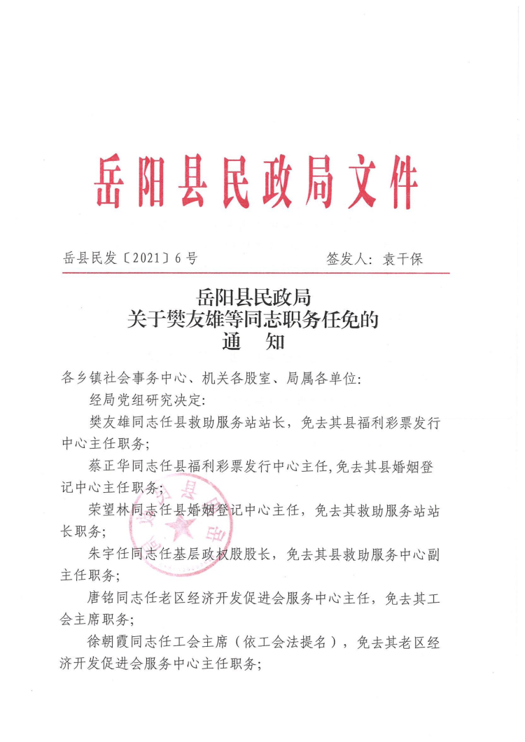 岳阳县民政局关于樊友雄等同志职务任免的通知