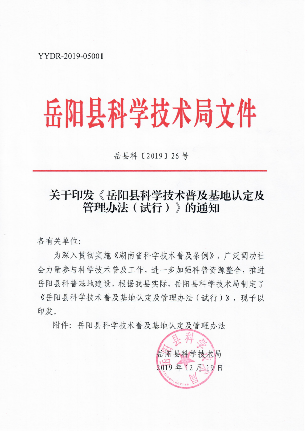 第九条 经认定的县科普基地,由县科技行政管理部门颁发《岳阳县科学技术普及基地认定证书》,授予“岳阳县科学技术普及基地”牌匾。