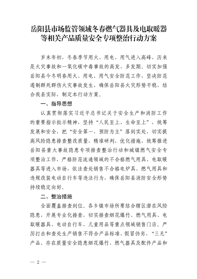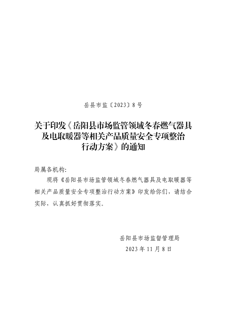 岳县市监〔2023〕8号关于印发《岳阳县市场监管领域冬春燃气器具及电取暖器等相关产品质量安全专项整治行动方案》的通知
