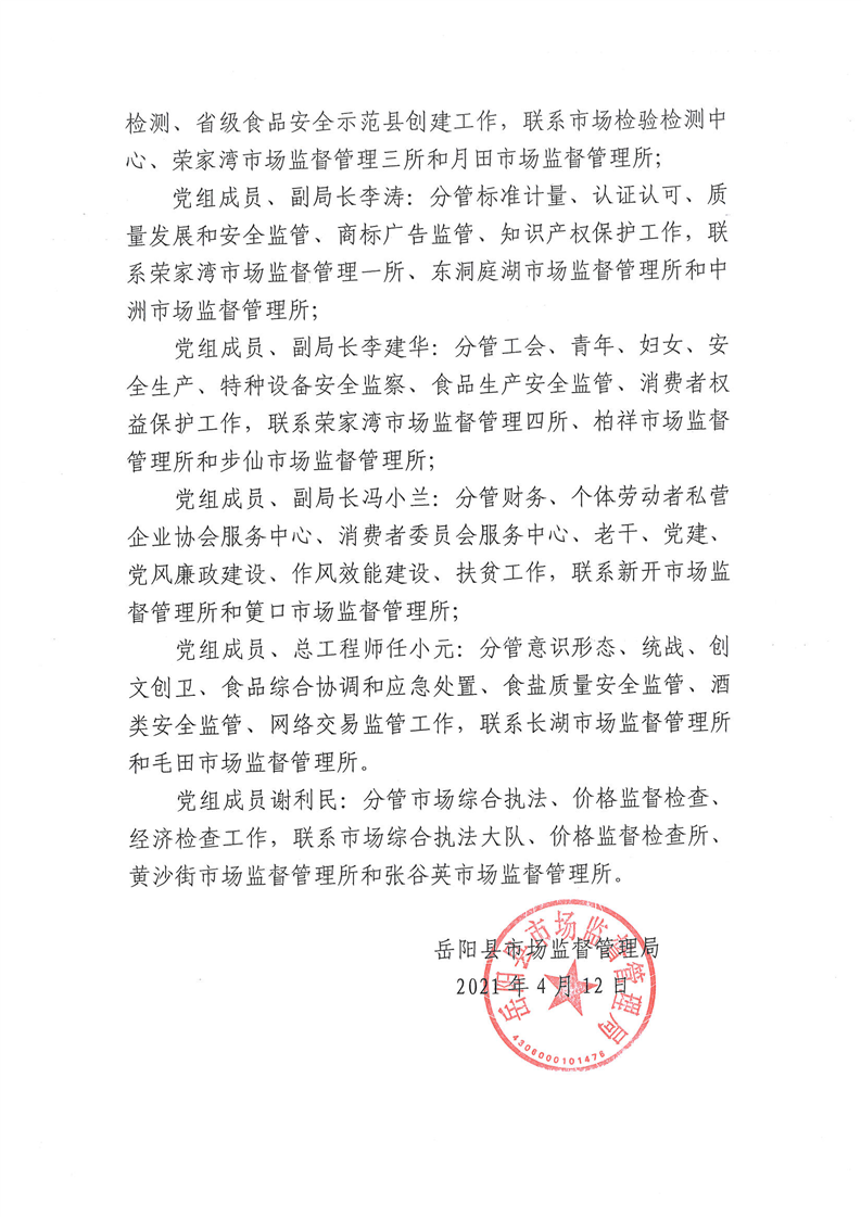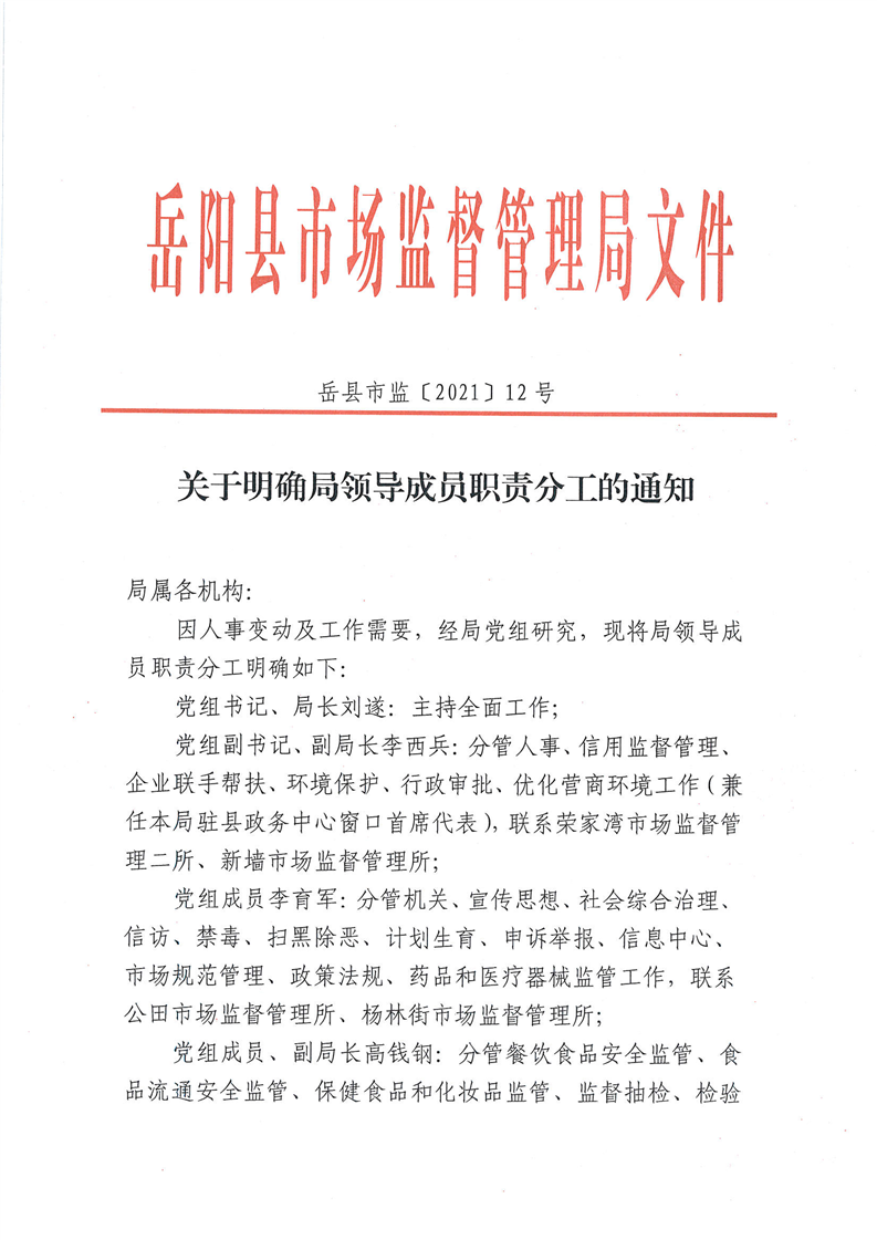 岳县市监〔2021〕12号关于明确局领导成员职责分工的通知