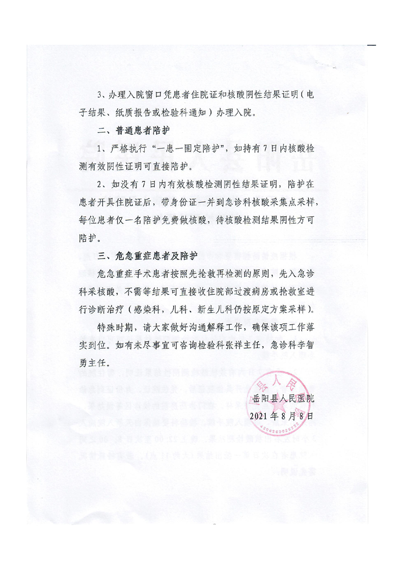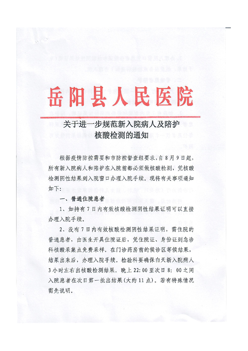岳阳县人民医院关于进一步规范住院病人及陪护核酸检测的规定
