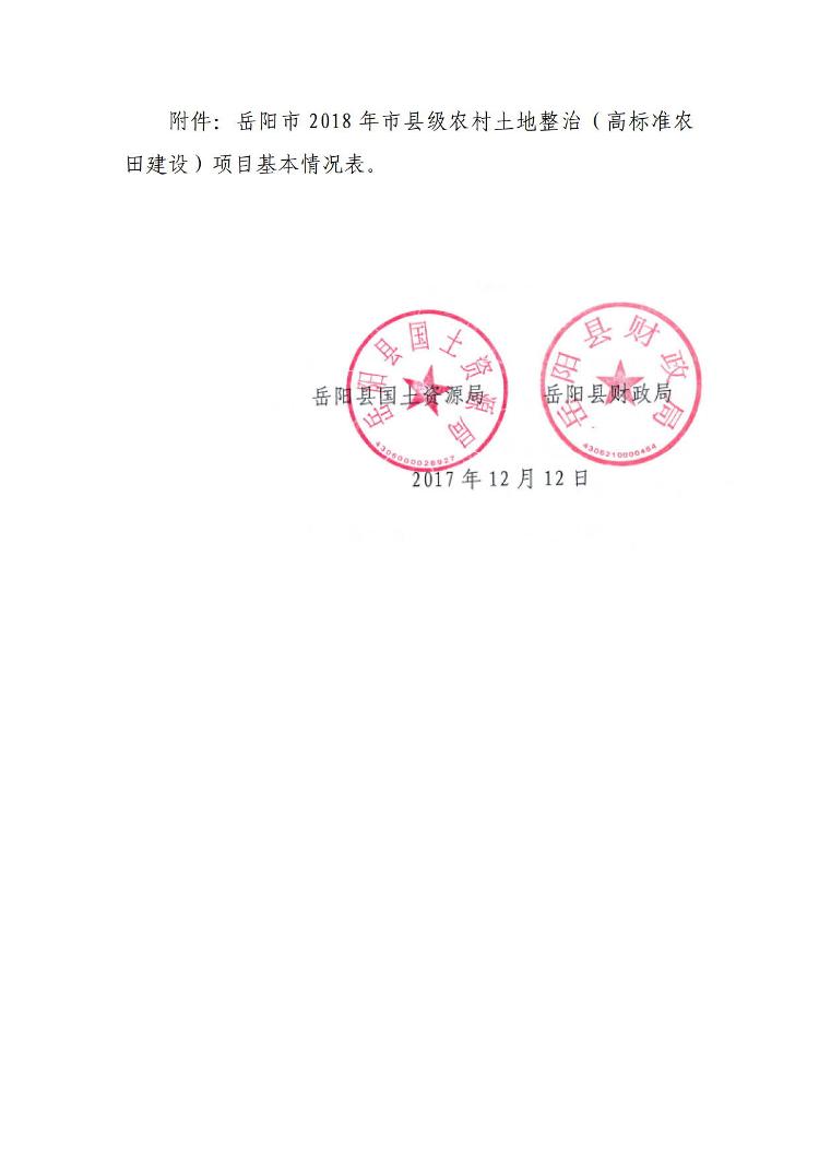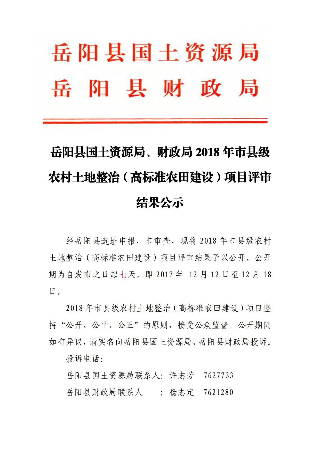 岳阳县国土资源局、财政局2018年市县级农村土地整治(高标准农田建设)项目评审结果公示