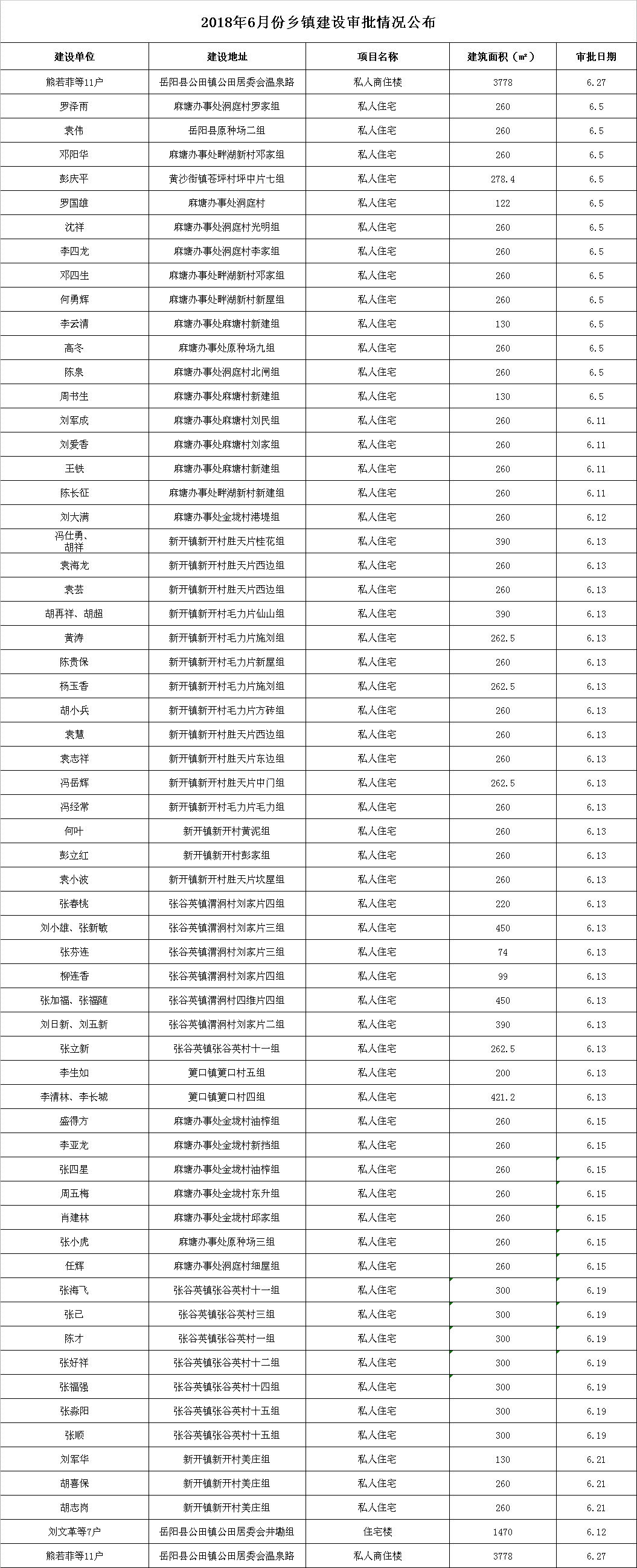 2018年6月份乡镇建设审批情况公布