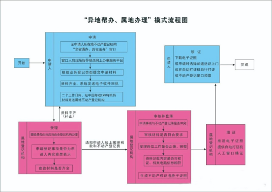 突破了属地申请的局限性,让企业、群众实现异地就近办、掌上办。通过“互联网+不动产登记”的模式,借助人脸识别、信息共享、电子签名、网上支付、电子证照共享应用等技术手段,以“全程网办”、“异地帮办,属地办理”和“异地代收,属地办理”三种模式办理,实现线上让“数据多跑路,企业群众少跑腿” 的“不见面办理”或线下“只跑一次,就近办理”,完成跨地区的登记服务。