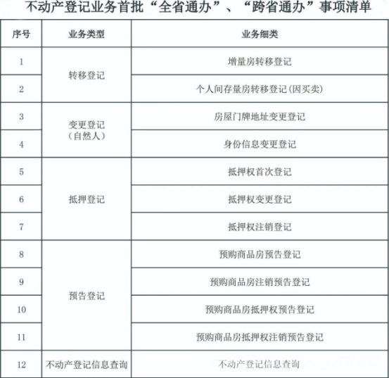 国有建设用地使用权及房屋所有权的转移登记、变更登记(自然人)、抵押登记、预告登记及不动产登记信息查询等五大类12项高频不动产登记业务(见附件1)。
