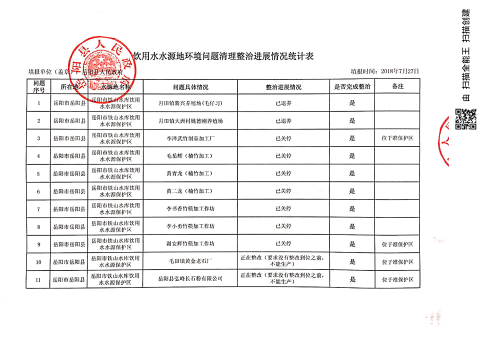 2018年7月饮用水水源地环境问题清理整治进展情况统计表