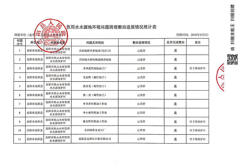 2018年9月饮用水水源地环境问题清理整治进展情况统计表