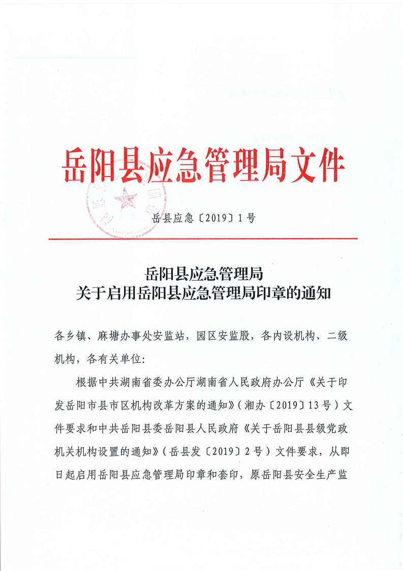 岳阳县应急管理局关于启用岳阳县应急管理局印章的通知