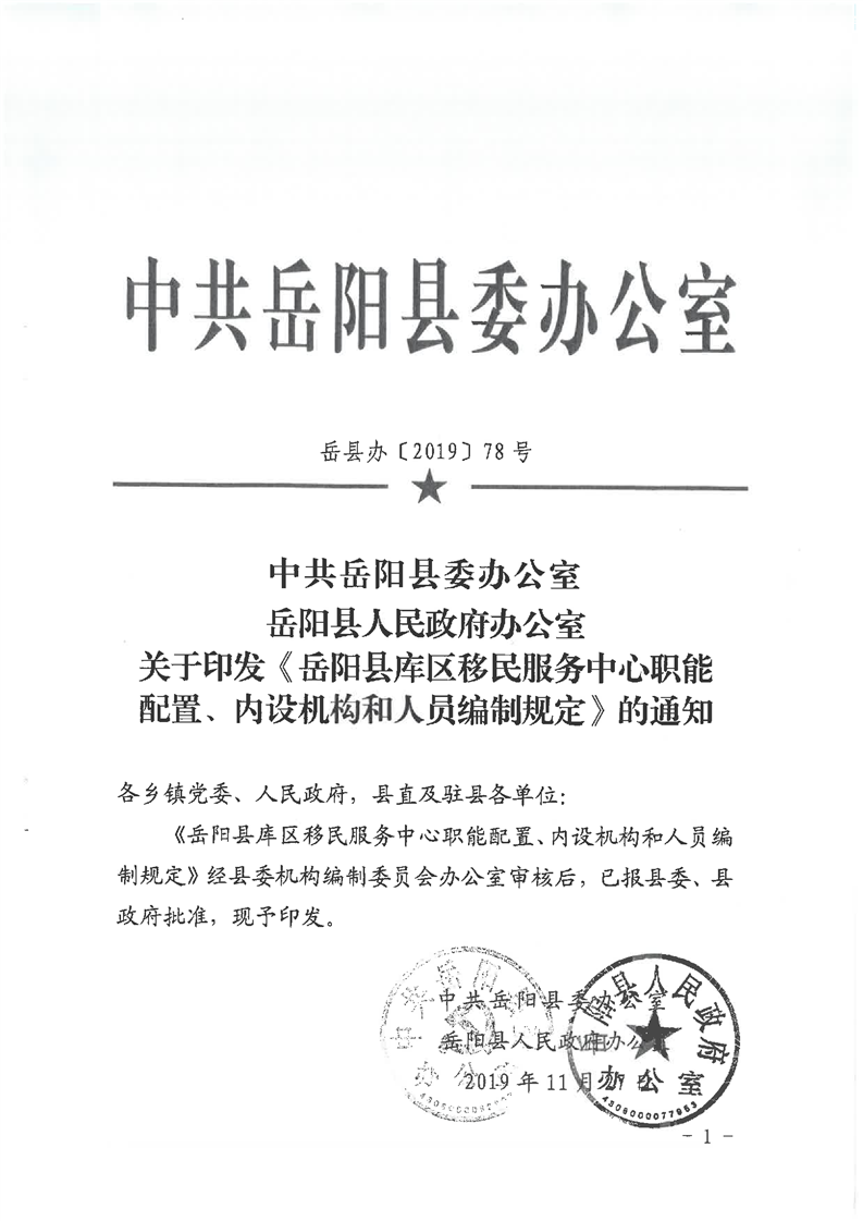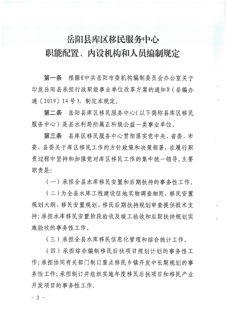 岳阳县库区移民服务中心职能配置、内设机构和人员编制规定