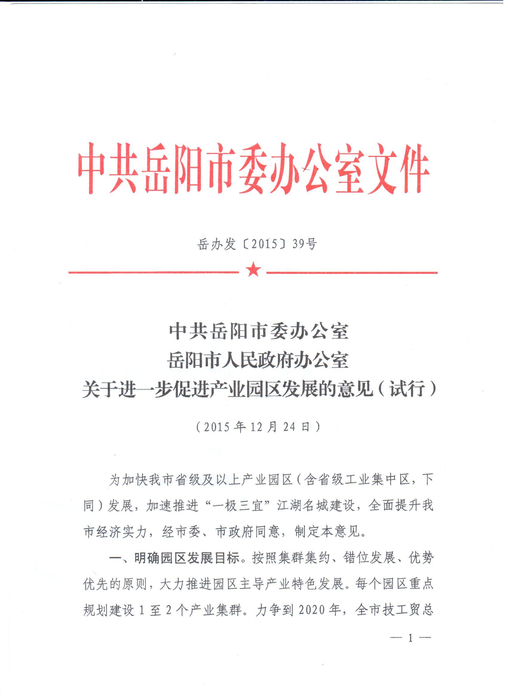 《中共岳阳市委办公室 岳阳市人民政府办公室关于进一步促进产业园区发展的意见(试行)》(岳办发〔2015〕39号)
