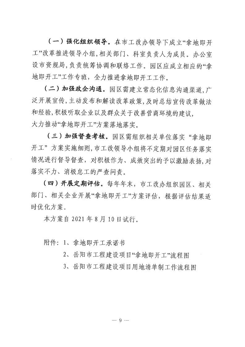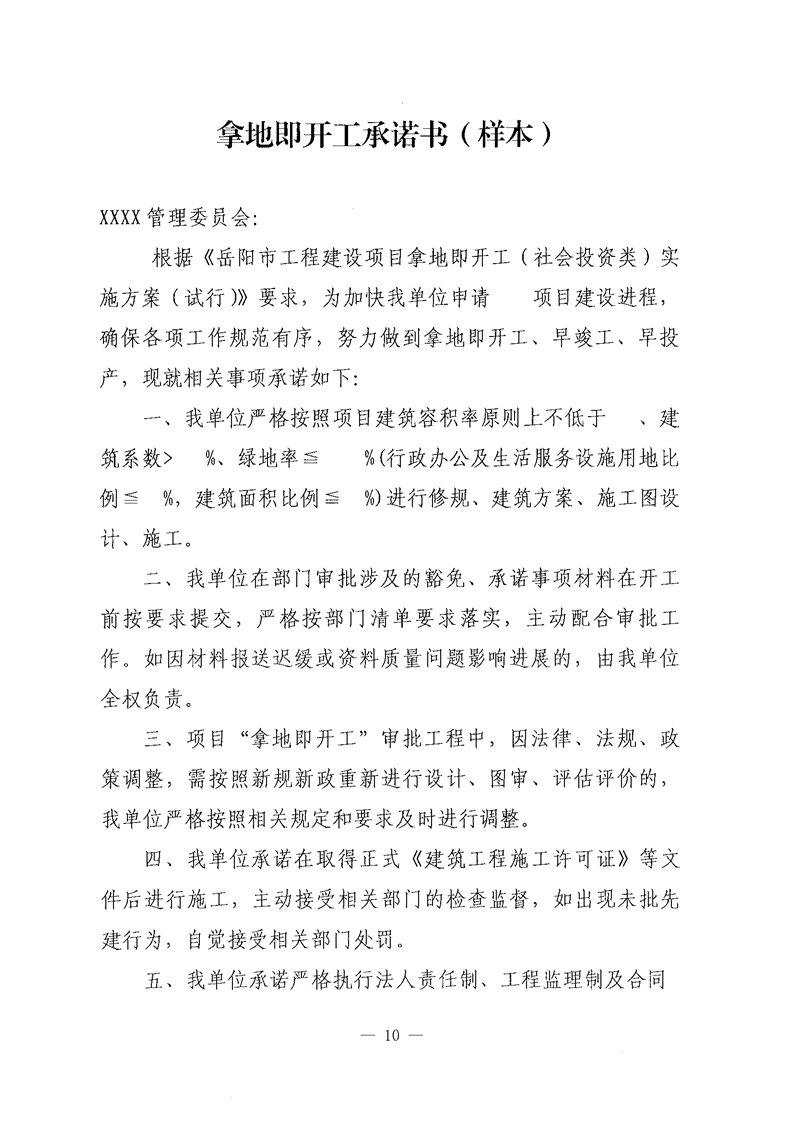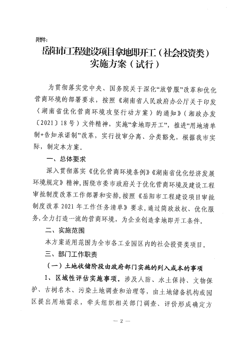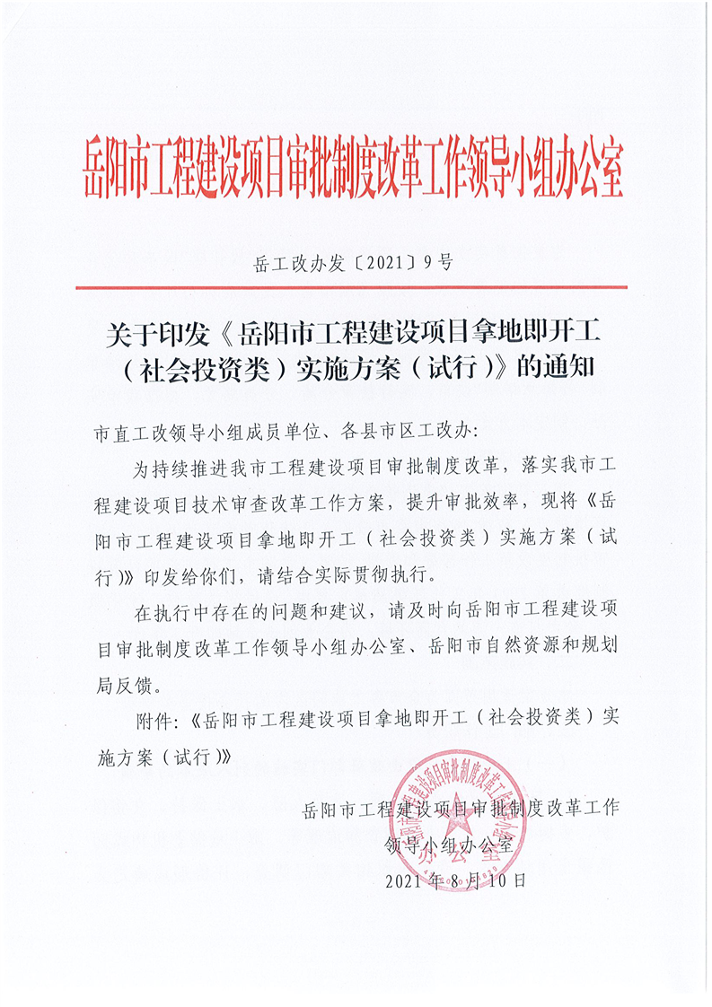 关于印发《岳阳市工程建设项目拿地即开工(社会投资)实施方案(试行)》的通知