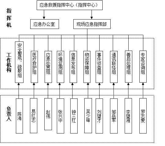 应急救援组织体系由指挥机构和工作机构两大部分组成。指挥机构为应急救援指挥中心,包括总指挥、副总指挥和指挥中心其他成员。工作机构为应急救援专业组,包括事件侦查组、环境监测组、应急处置组、医疗救护组、物资保障组、通讯联络组、信息发布组、安全警戒、疏散组、善后处理组、专家咨询组。