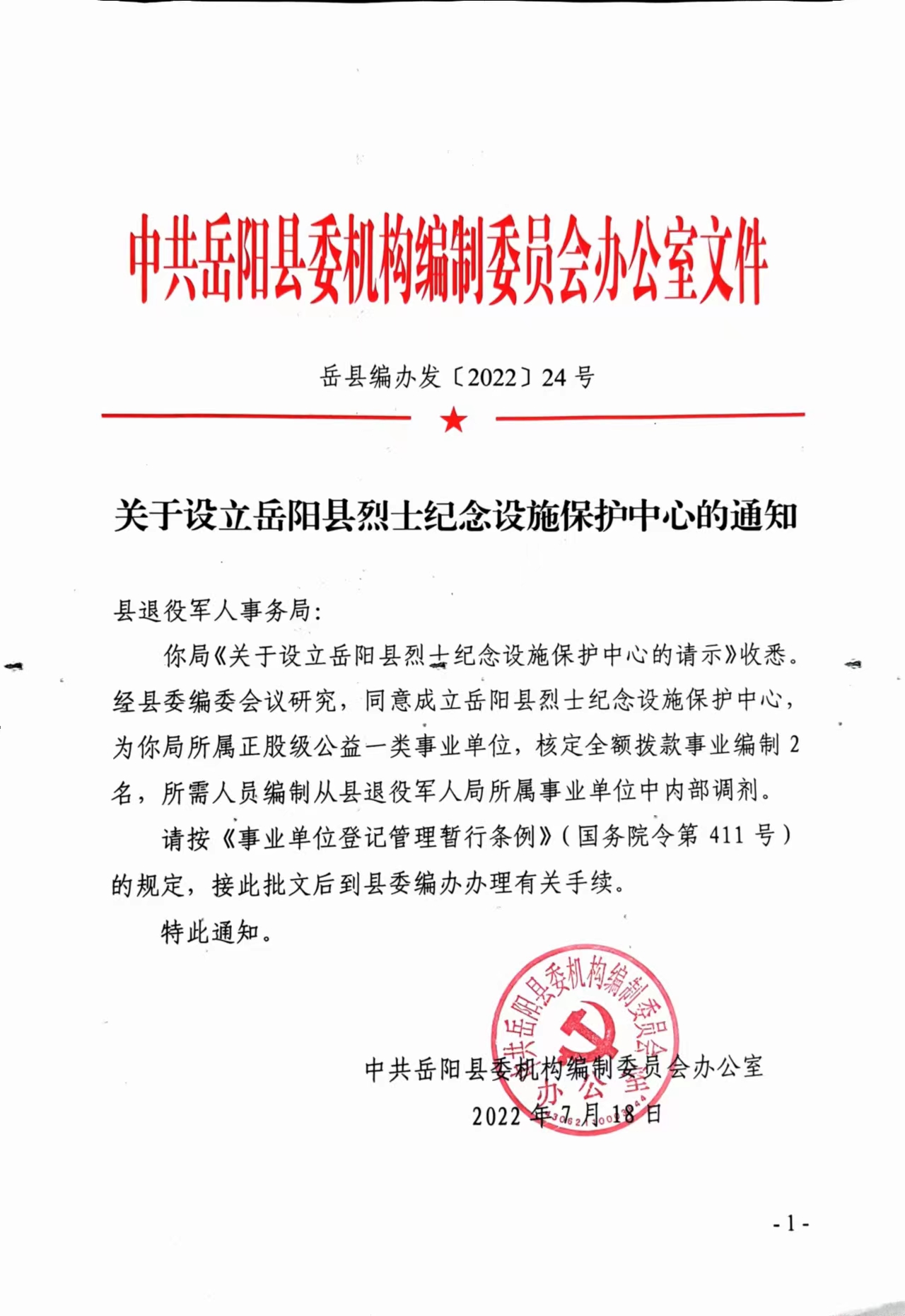 关于设立岳阳县烈士纪念设施保护中心的通知