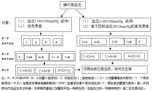 1.药物治疗。常用降压药物包括钙拮抗剂(CCB)、血管紧张素转换酶抑制剂(ACEI)、血管紧张素II受体拮抗剂(ARB)、噻嗪类利尿药和b-受体阻滞剂五大类以及由上述药物组成的固定配比复方制剂。
