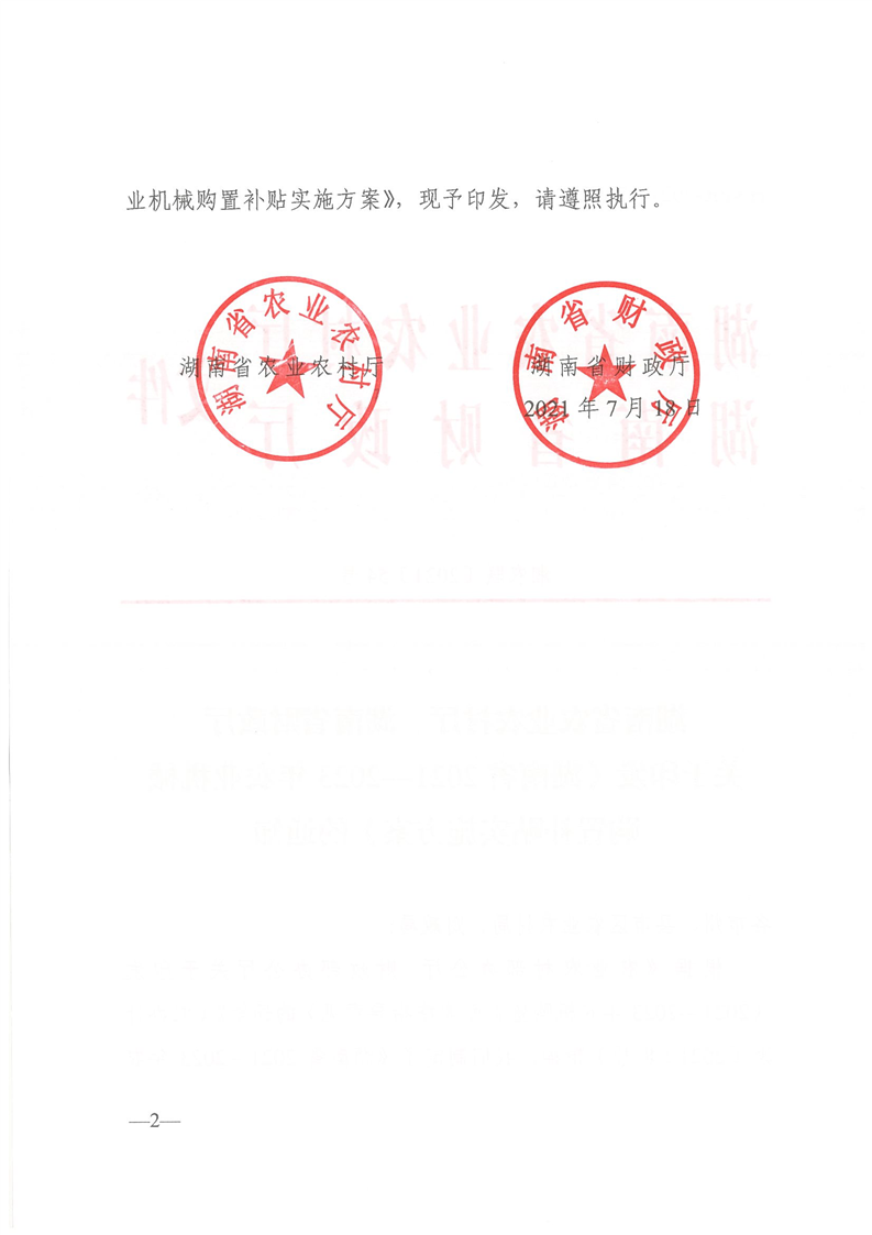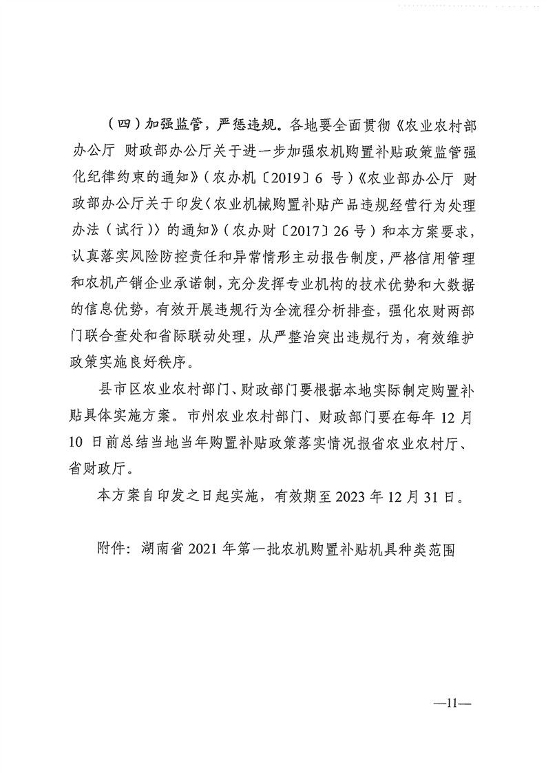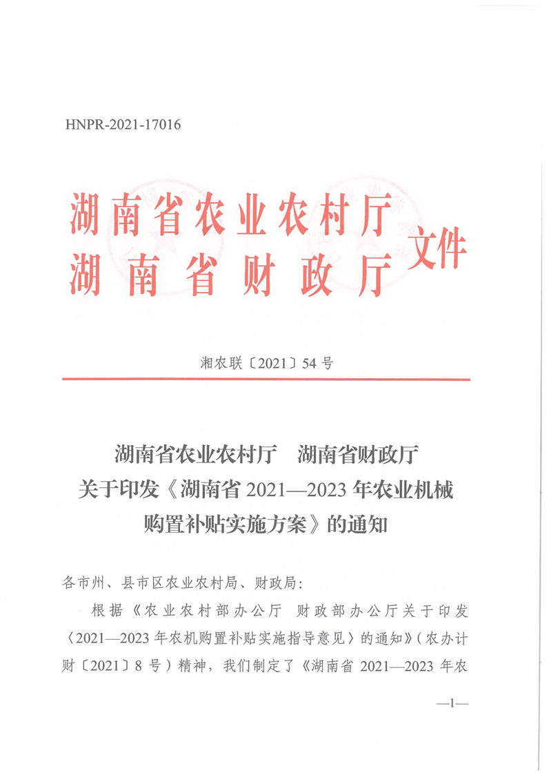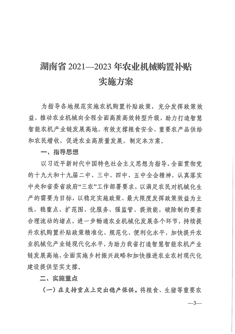 湖南省农业农村厅 湖南省财政厅关于印发《湖南省2021-2023年农业机械购置补贴实施方案》的通知