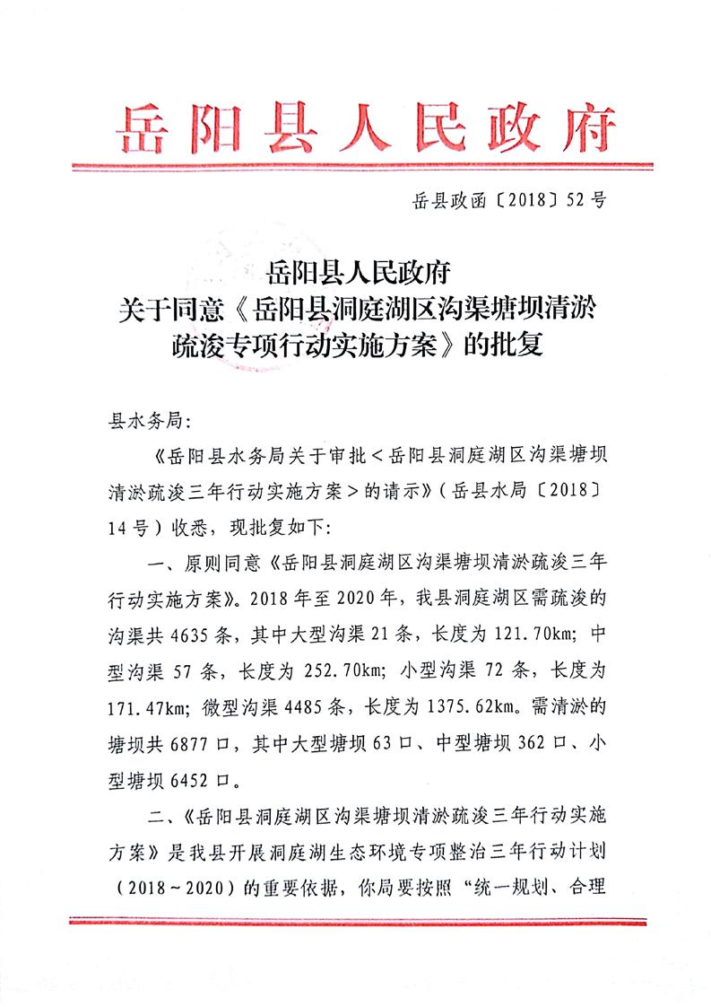 岳阳县人民政府关于同意《岳阳县洞庭湖区沟渠塘坝清淤疏浚专项行动实施方案》的批复