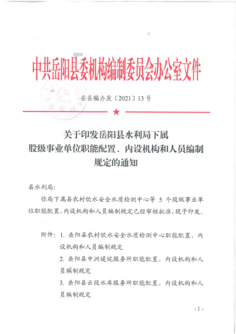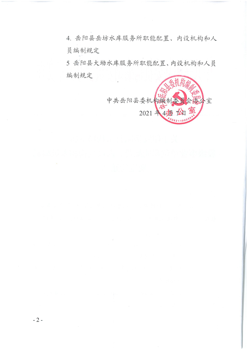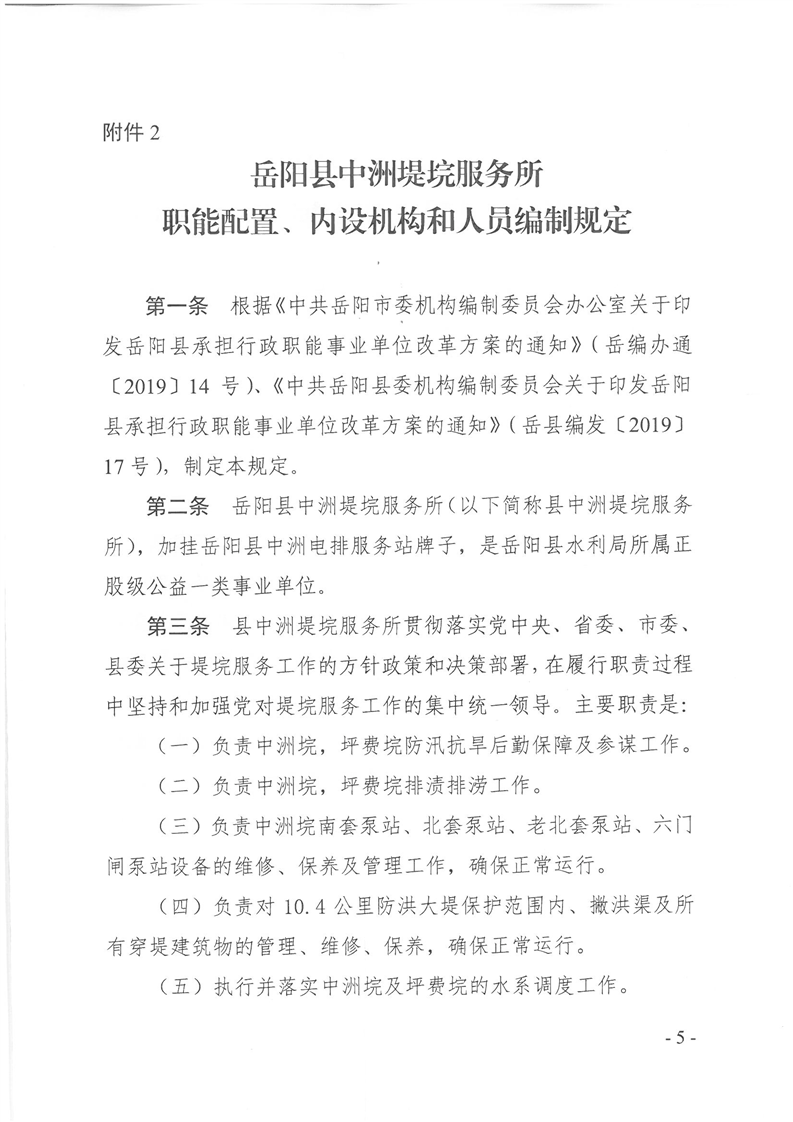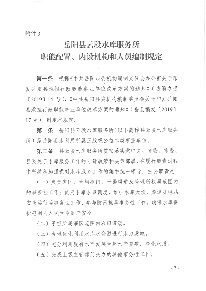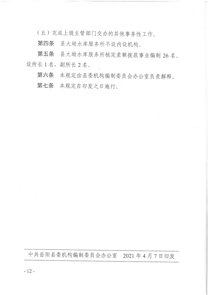 岳阳县农村安全水质检测中心、岳阳县中洲堤垸服务所、岳阳县云段水库服务所、岳阳县岳坊水库服务所、岳阳县大坳水库服务所职能配置、内设机构和人员编制规定