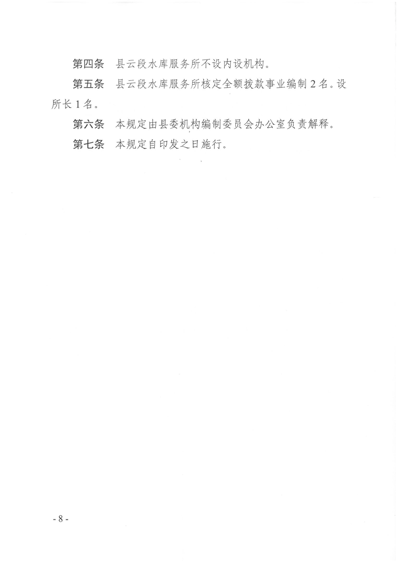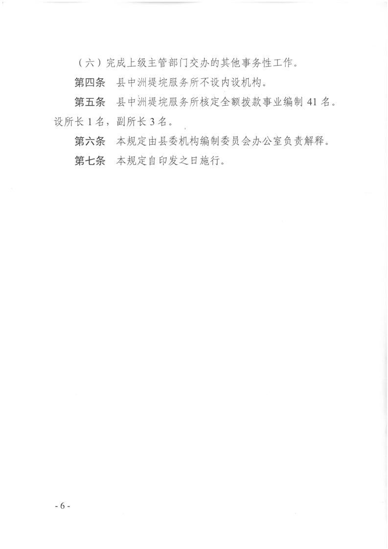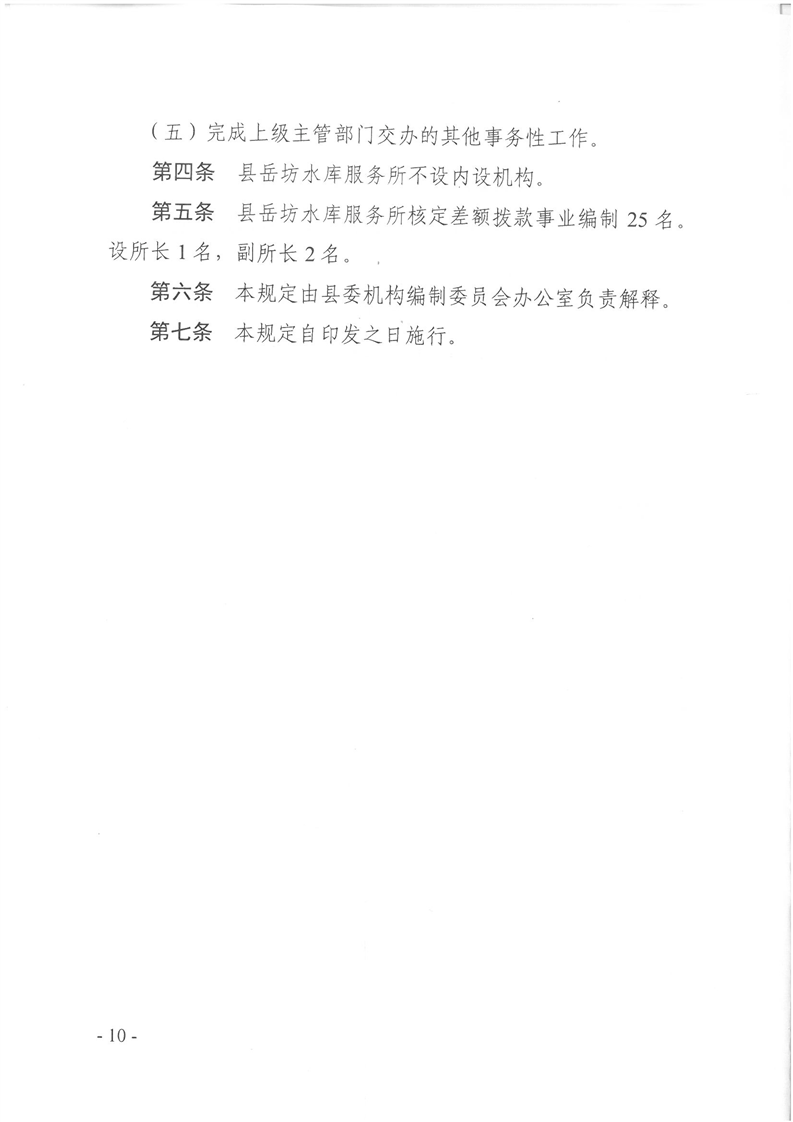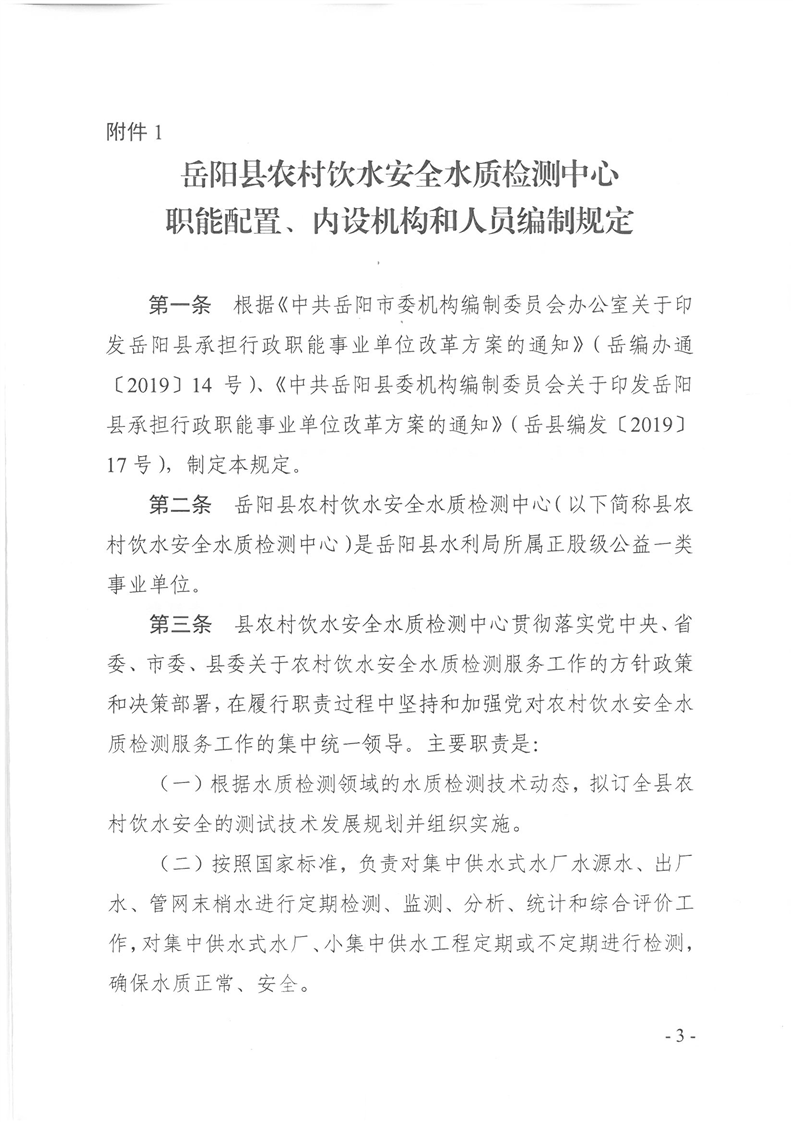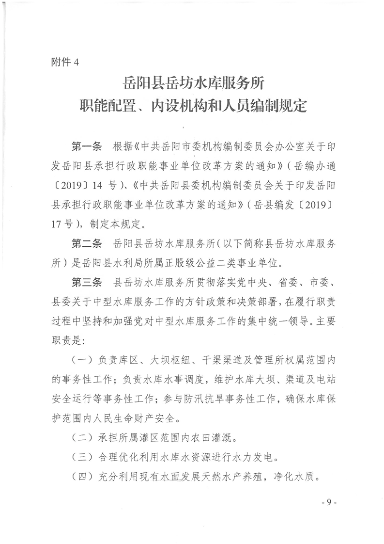 岳阳县农村安全水质检测中心、岳阳县中洲堤垸服务所、岳阳县云段水库服务所、岳阳县岳坊水库服务所、岳阳县大坳水库服务所职能配置、内设机构和人员编制规定