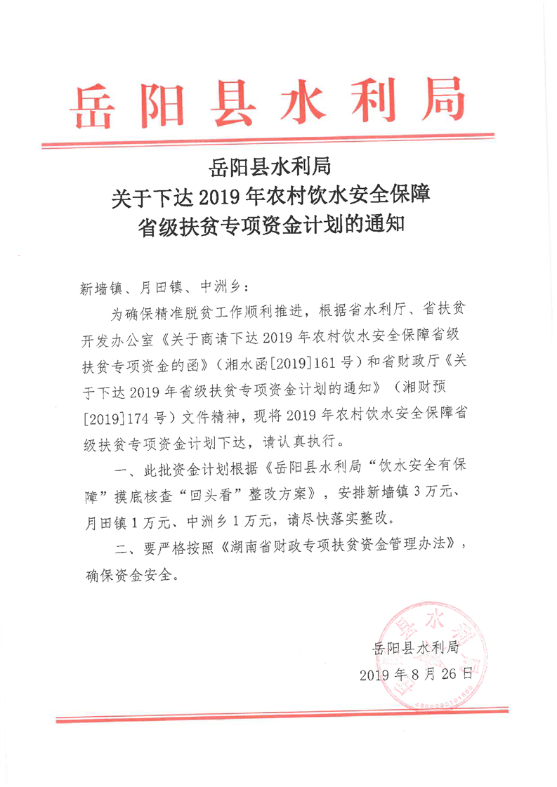 岳阳县水利局关于下达2019年农村饮水安全保障省级扶贫专项资金计划的通知