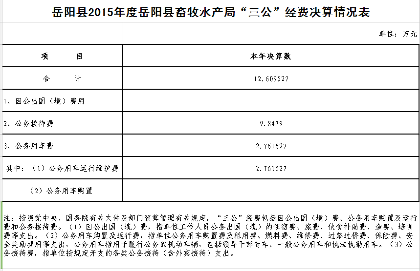 岳阳县2015年度岳阳县畜牧水产局“三公”经费决算情况表