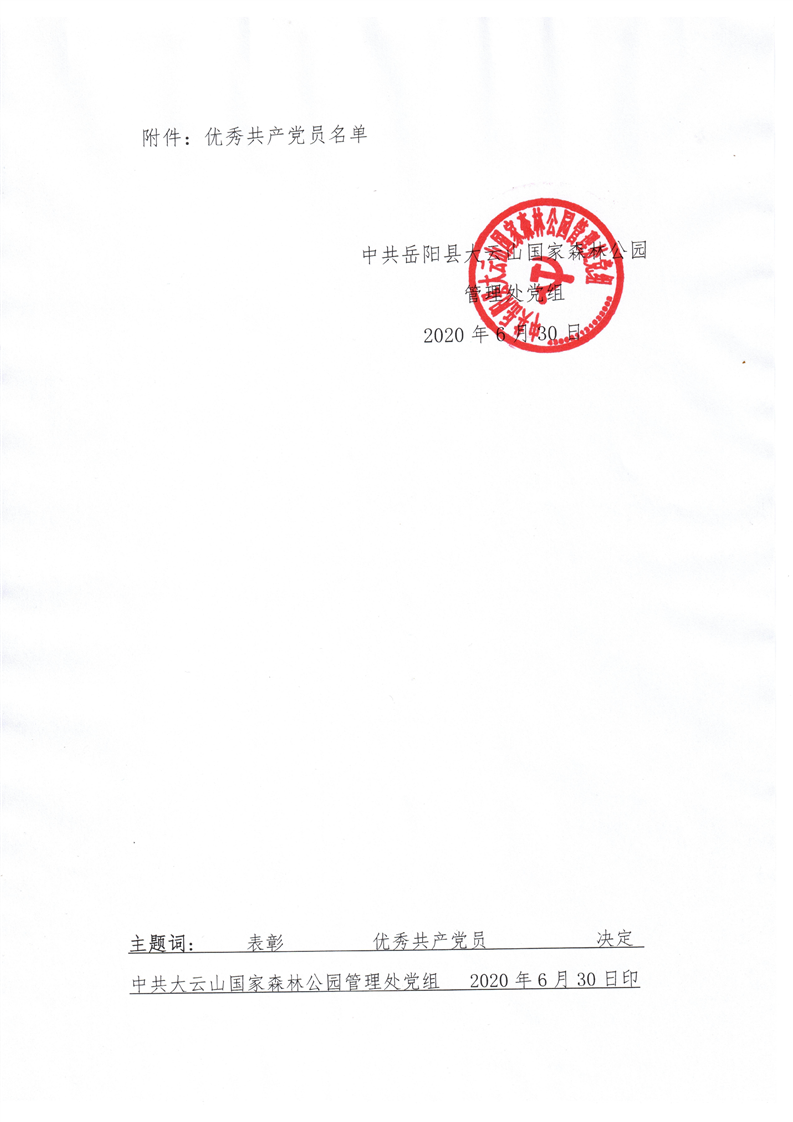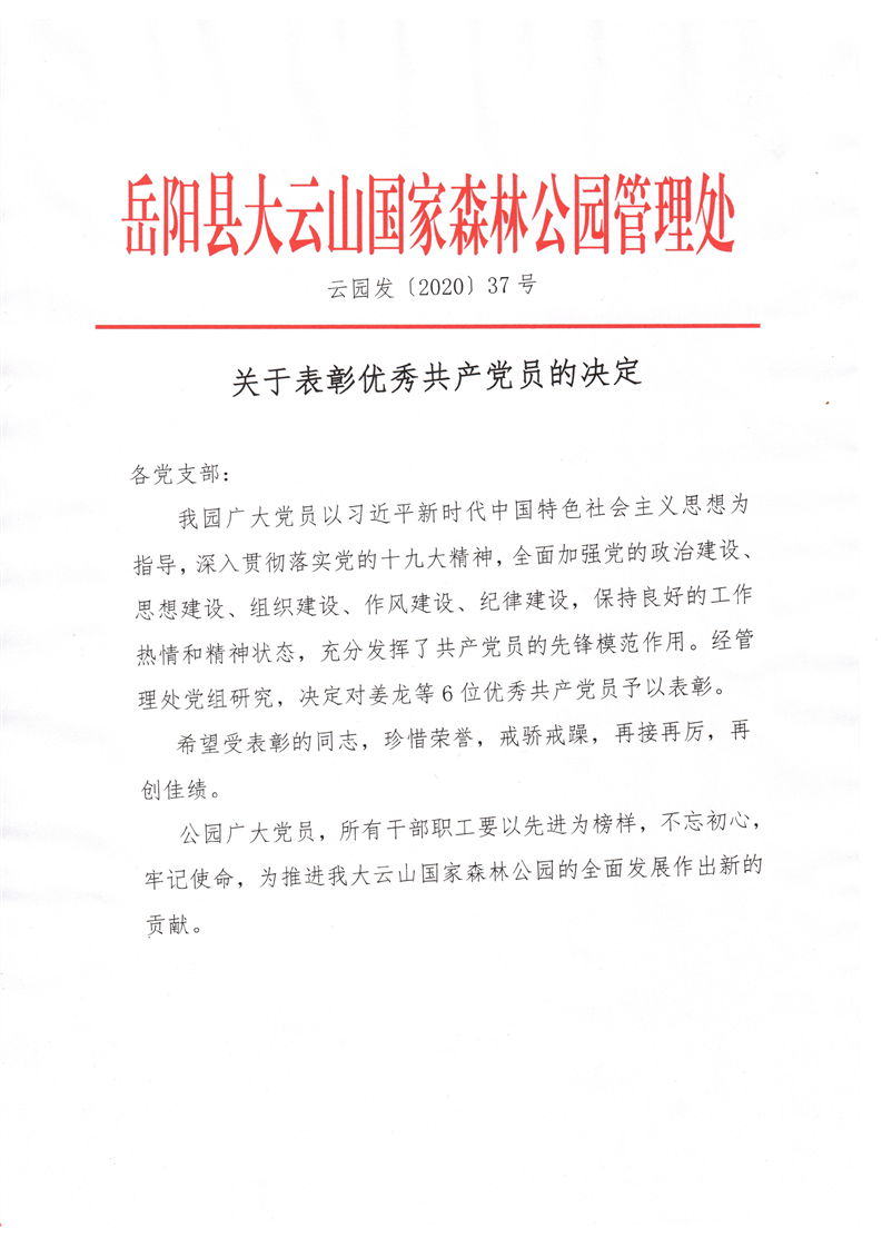 大云山国家森林公园管理处党组关于表彰优秀共产党员的决定
