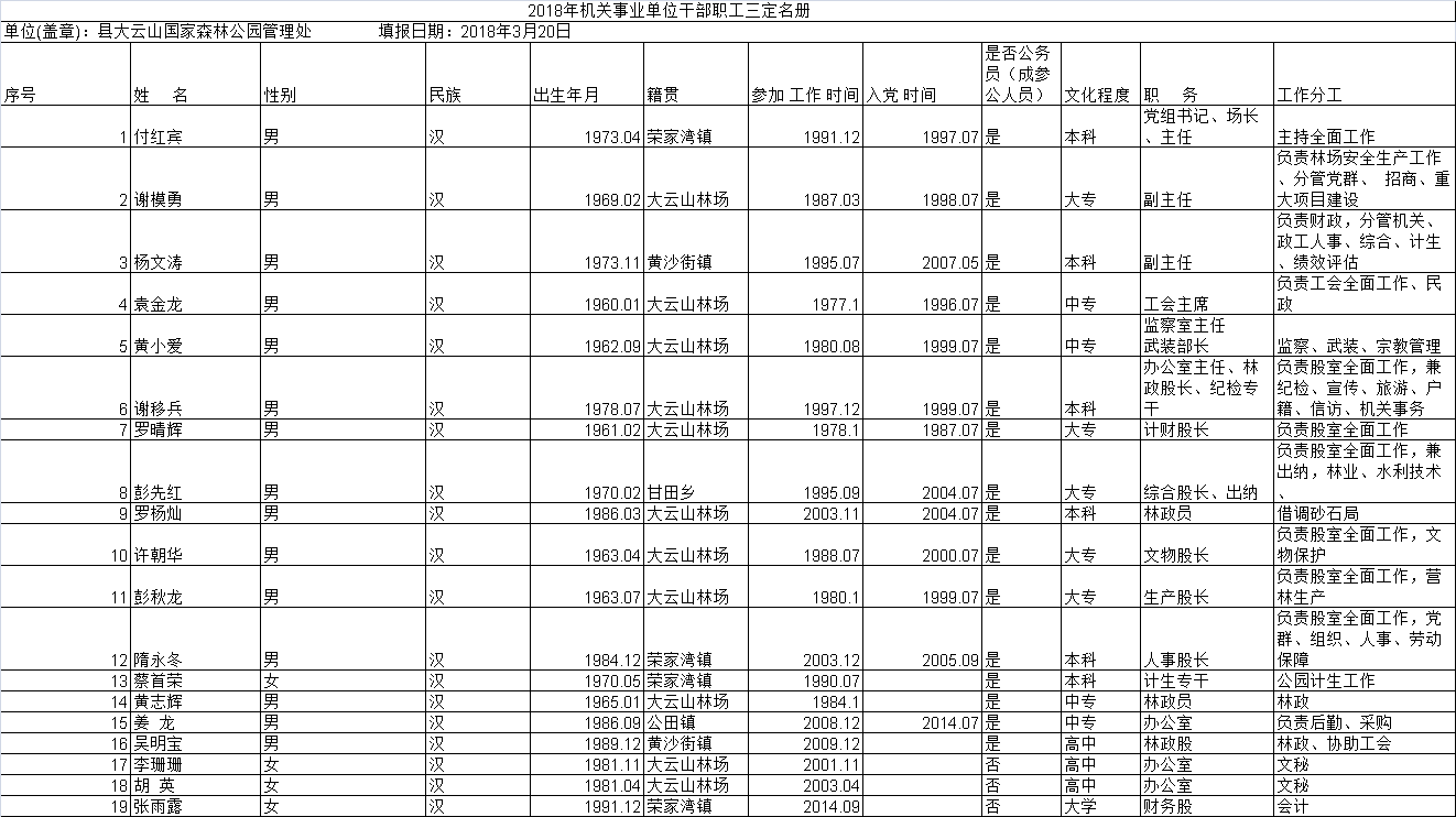 大云山管理处三定名册