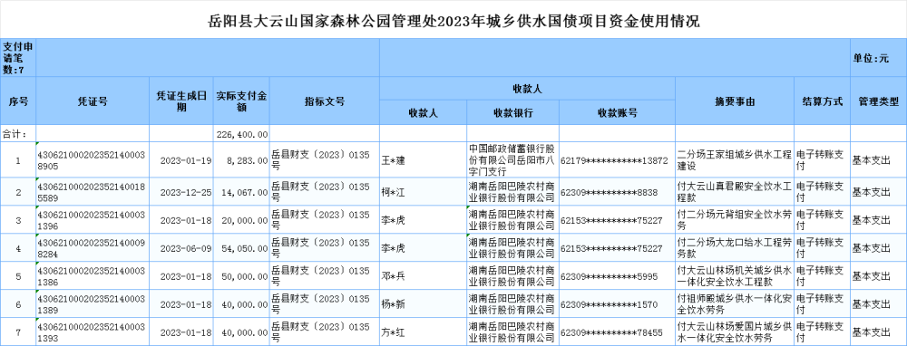岳阳县大云山国家森林公园管理处2023年城乡供水国债项目资金使用情况
