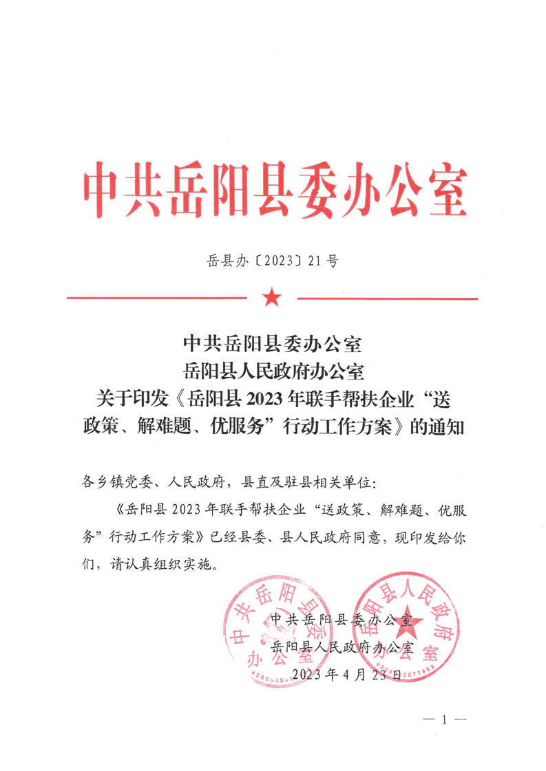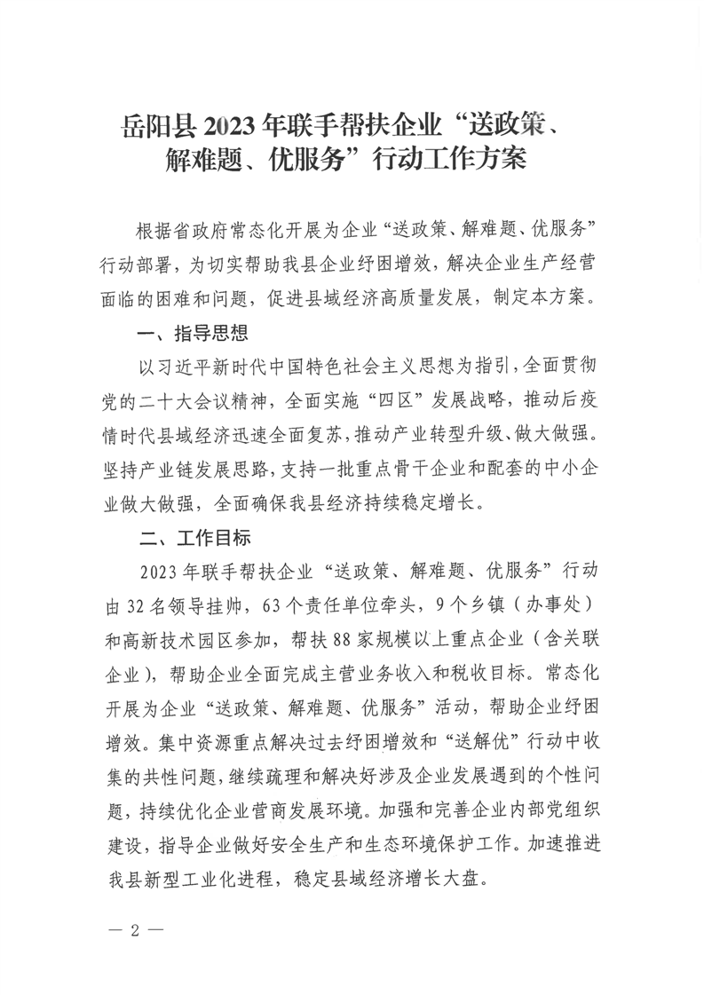 关于印发《岳阳县2023年联手帮扶企业“送政策、解难题、优服务”行动工作方案》的通知