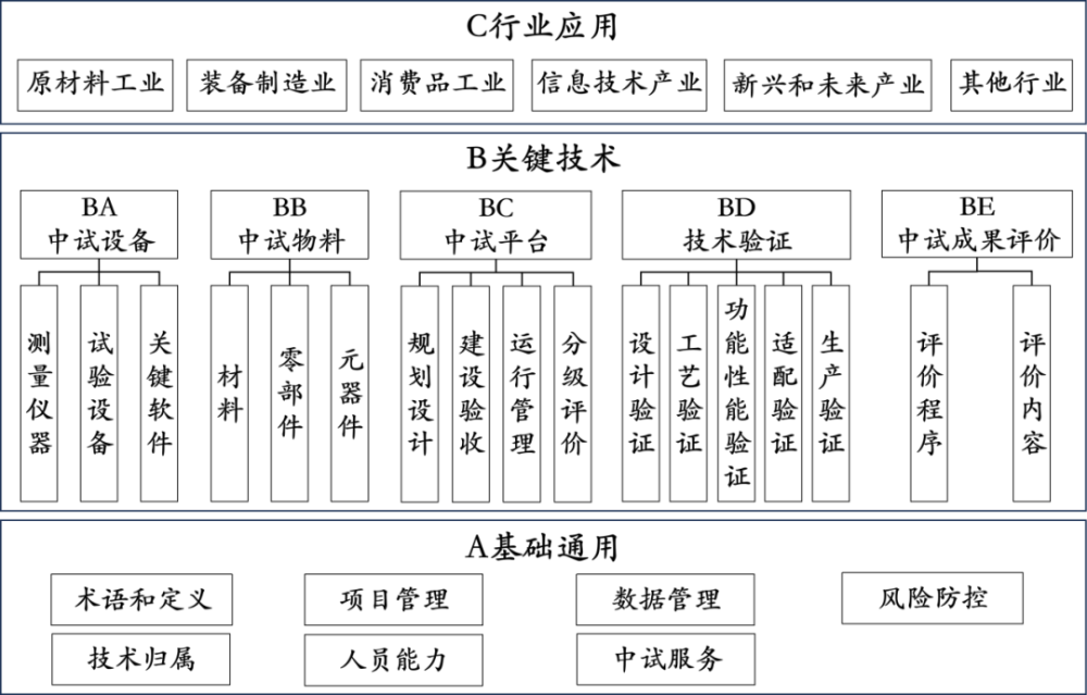 制造业中试标准体系结构包括基础通用、关键技术、行业应用等3个部分,如图1所示。其中,基础通用标准规范制造业中试的通用性技术和要求,是制造业中试标准体系的底层支撑。关键技术标准规范制造业中试设备、物料、平台、验证、成果评价等要求,是制造业中试标准体系的核心内容。行业应用标准规范各行业中试的应用要求,确保中试活动在具体行业规范科学开展,是制造业中试标准体系的应用拓展。