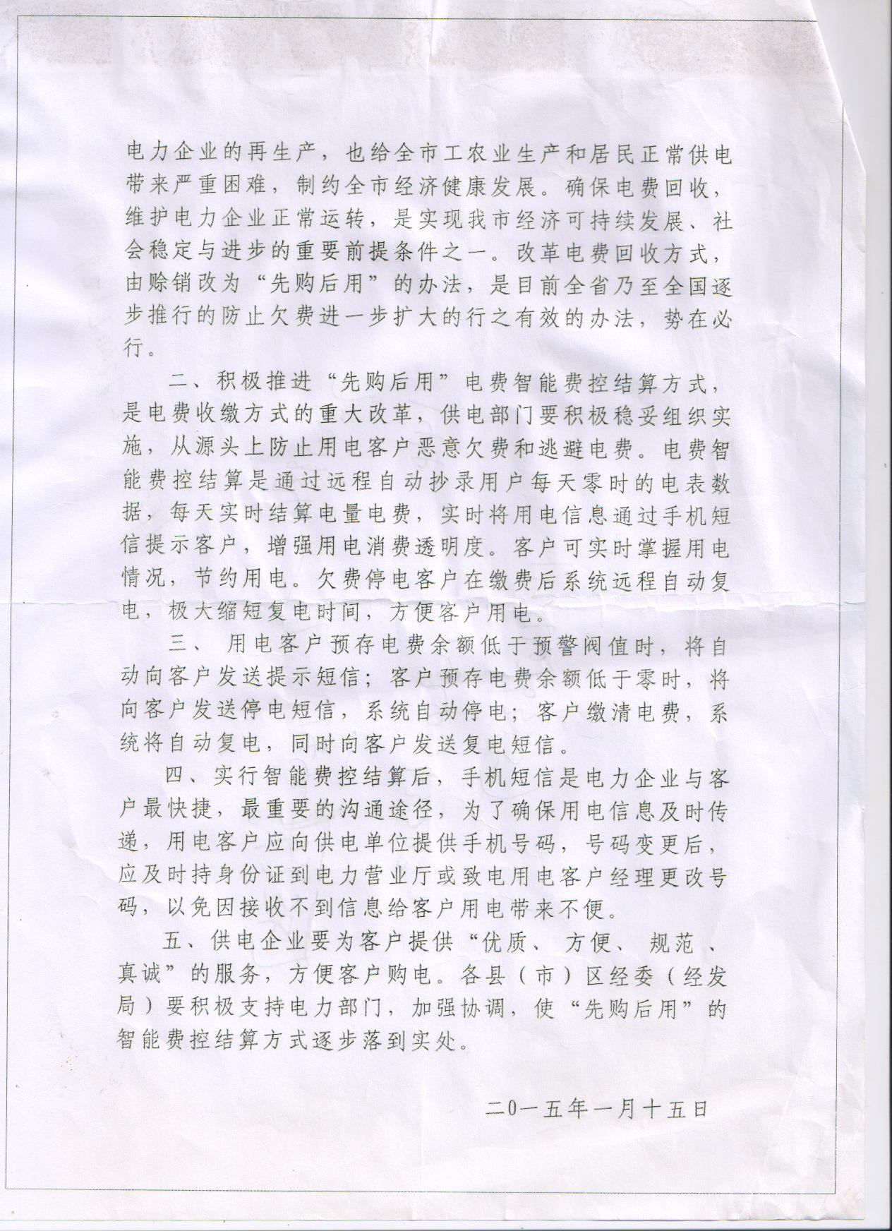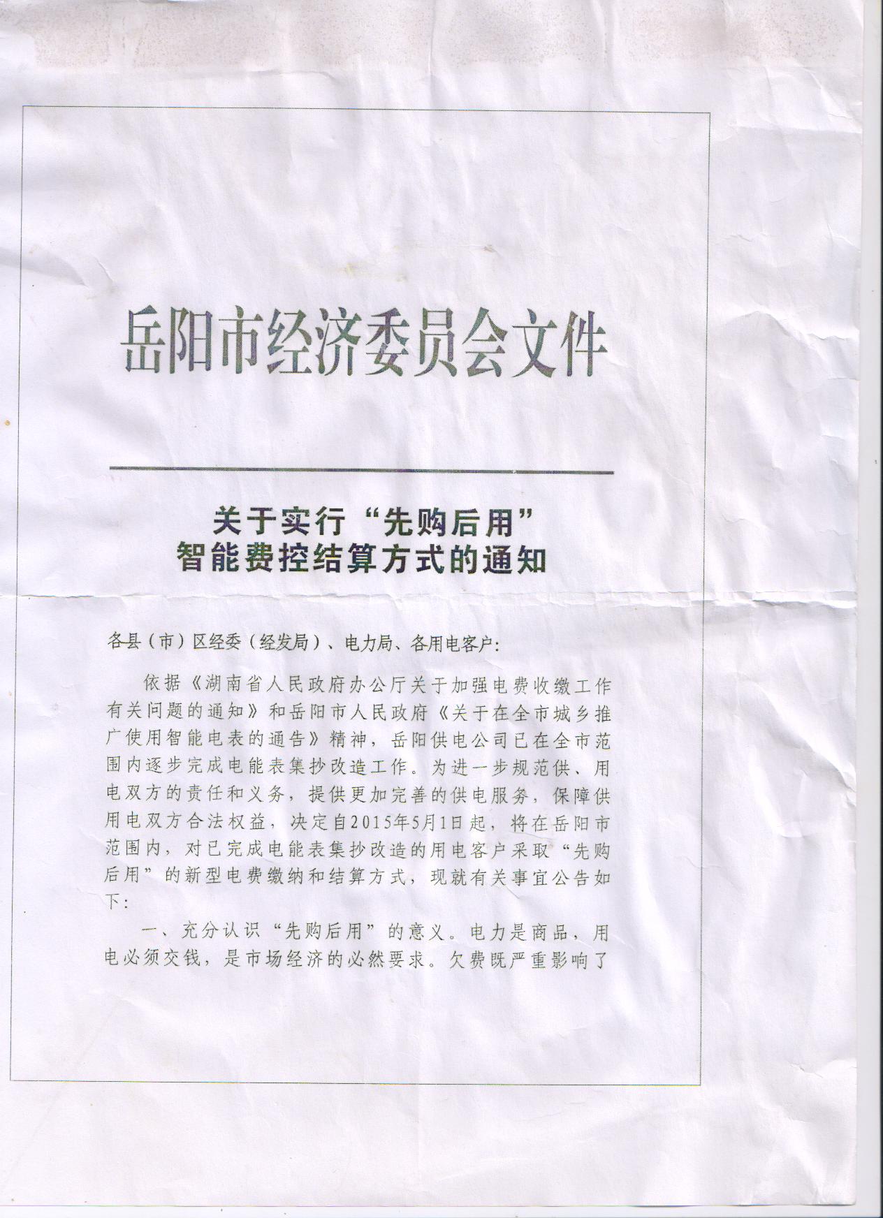 岳阳市经济委员会实行“先购后用”智能费控结算方式的通知