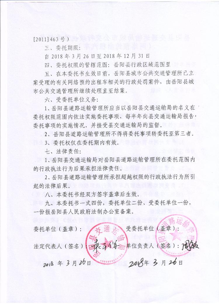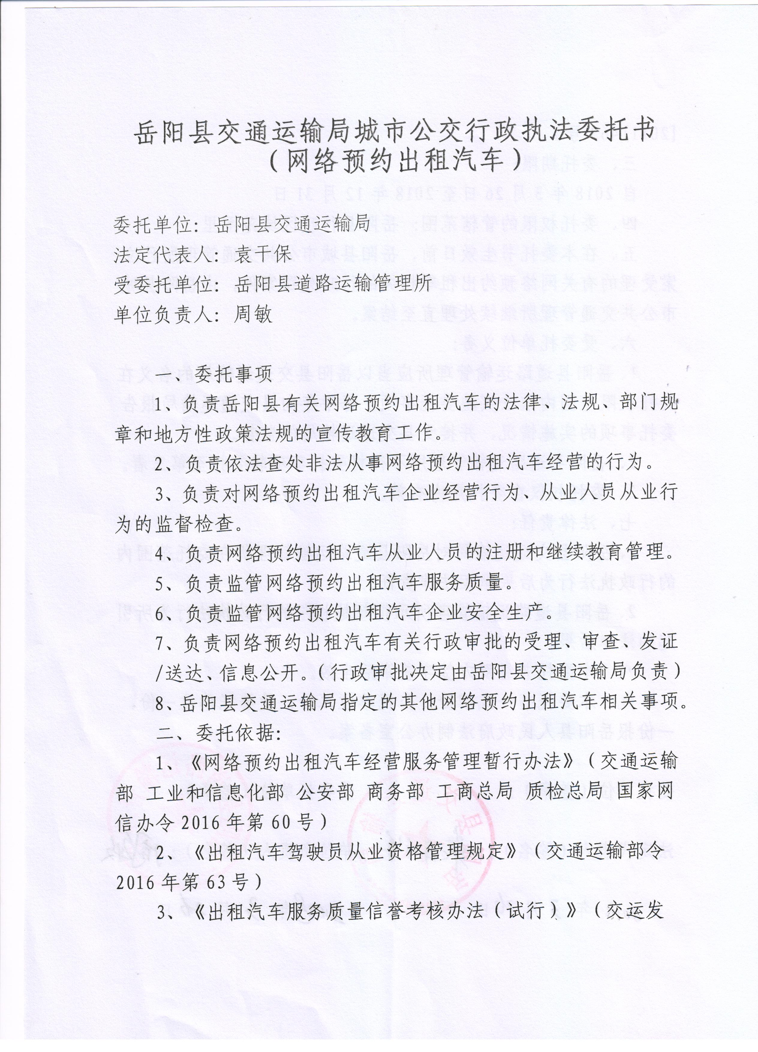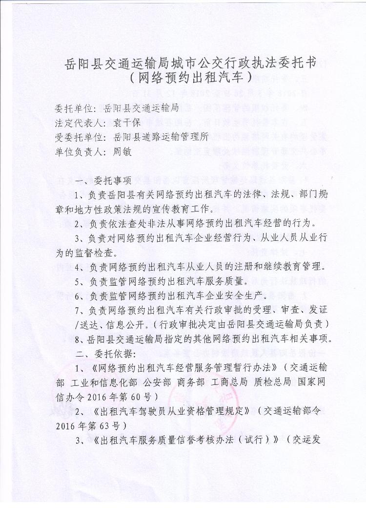 岳阳县交通运输局城市公交行政执法委托书(网络预约出租汽车)