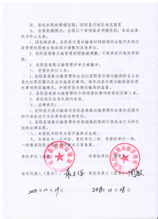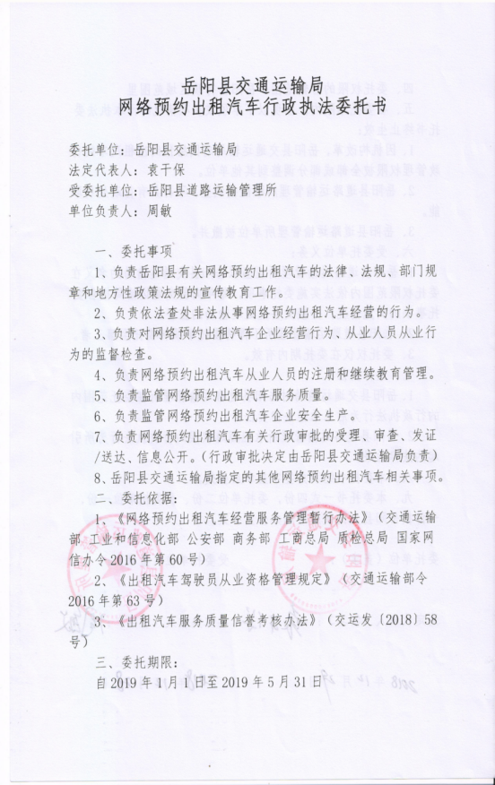 岳阳县交通运输局网络预约出租汽车行政执法委托书(20090101-20190531)