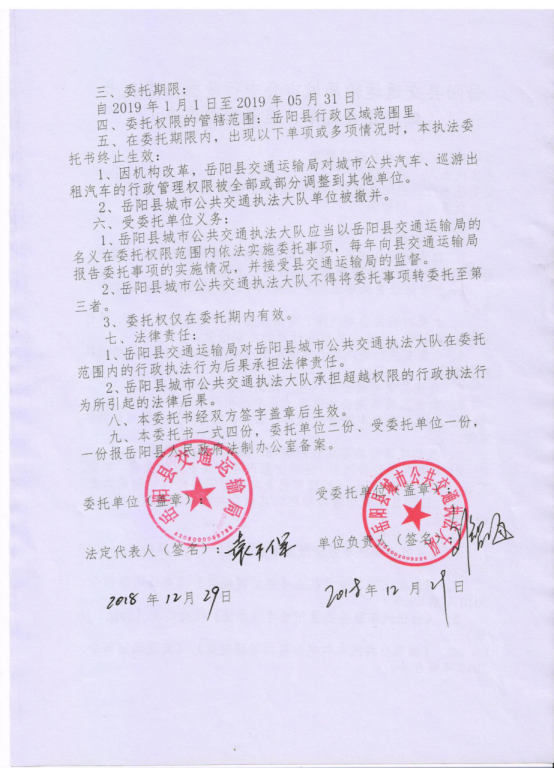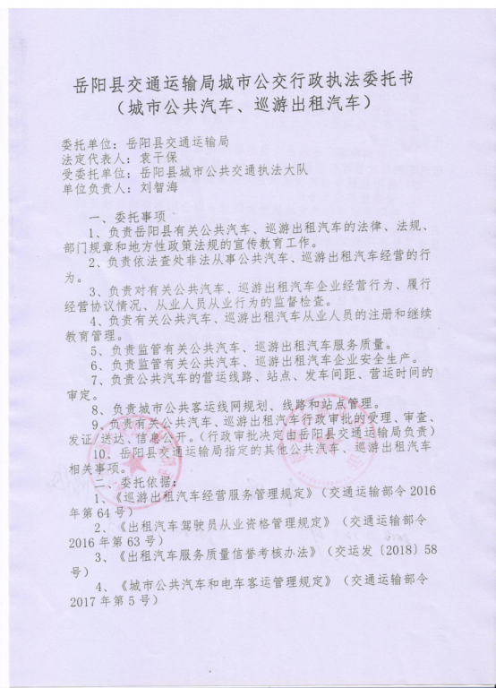 岳阳县交通运输局城市公共汽车、巡游出租汽车行政执法委托书(20090101-20190531)