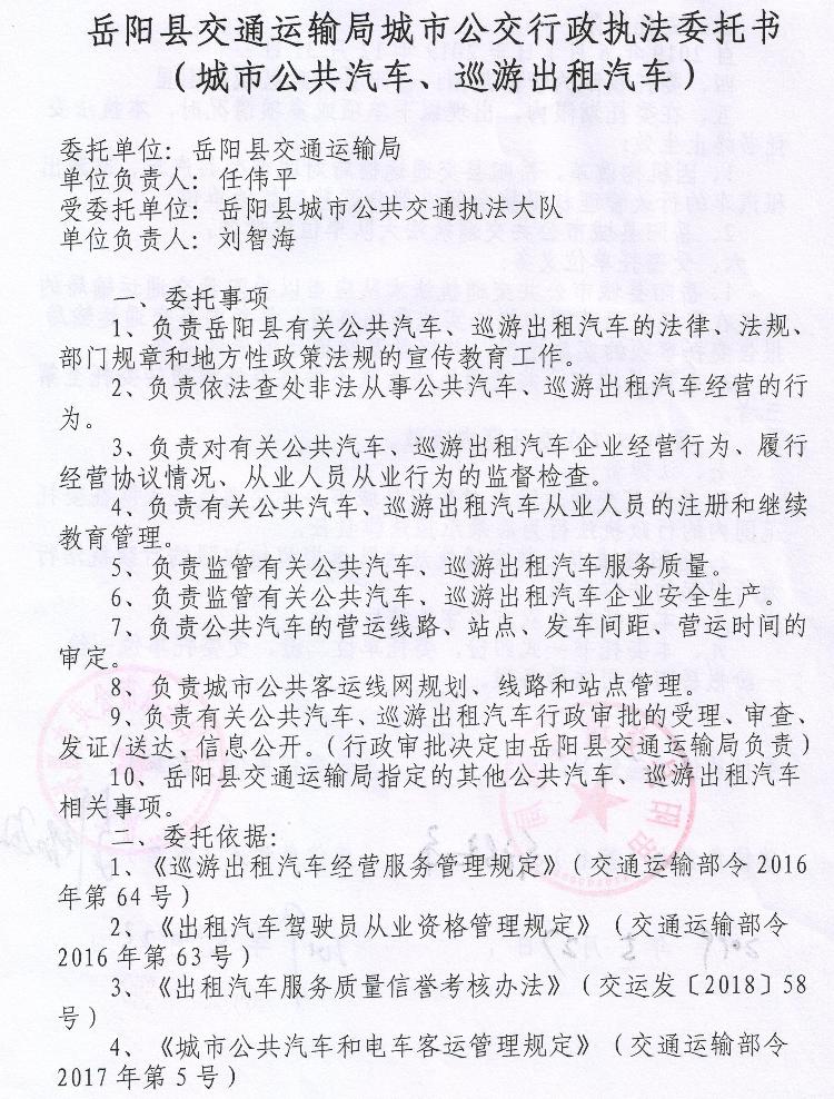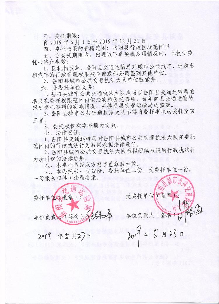 岳阳县城市公共汽车巡游出租汽车行政执法委托书(20190601-20191231)