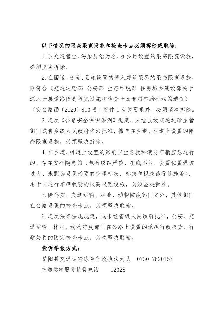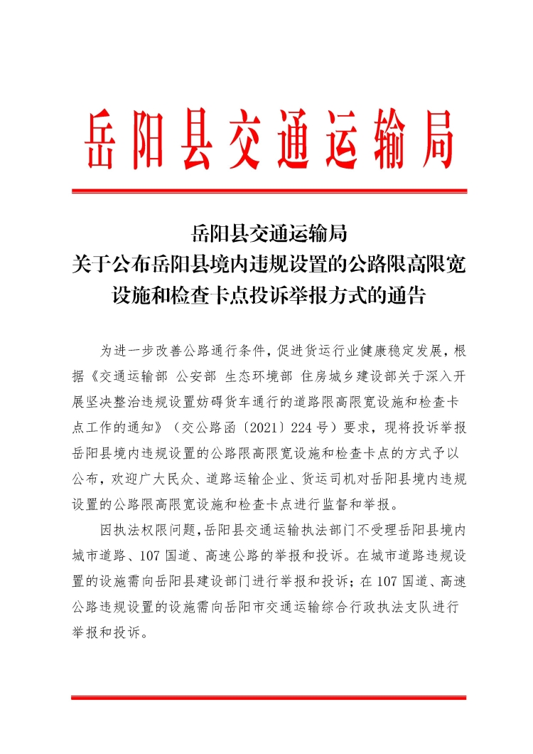 岳阳县交通运输局关于公布岳阳县境内违规设置的公路限高限宽设施和检查卡点投诉举报方式的通告