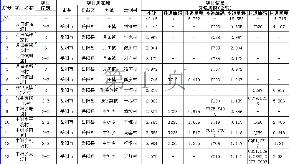 2015年岳阳县农村公路通畅工程建议计划明细表
