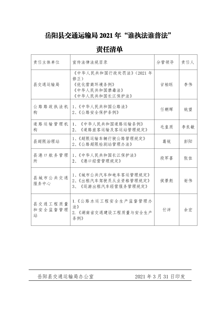 岳阳县交通运输局2021年度“谁执法谁 普法”责任清单