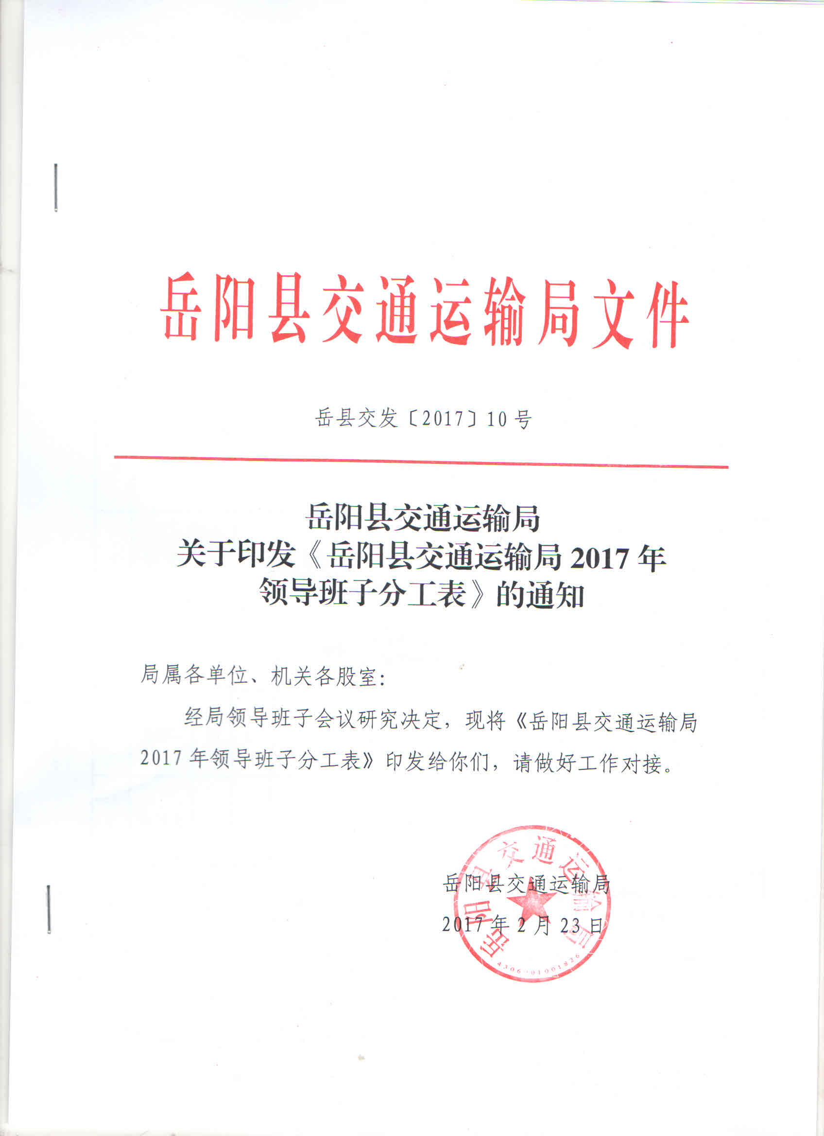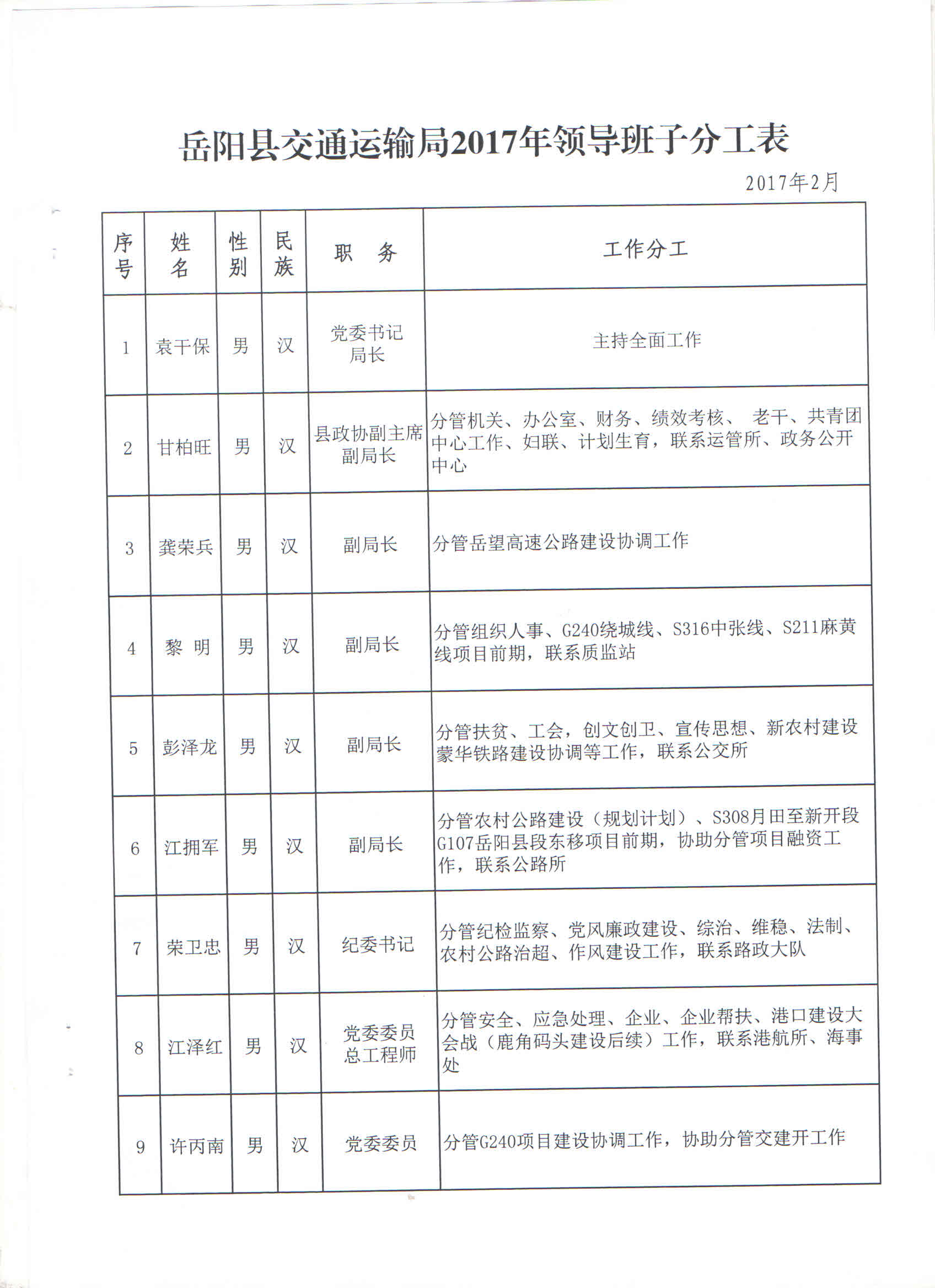 岳阳县交通运输局2017年领导班子分工表(2017年2月23日)